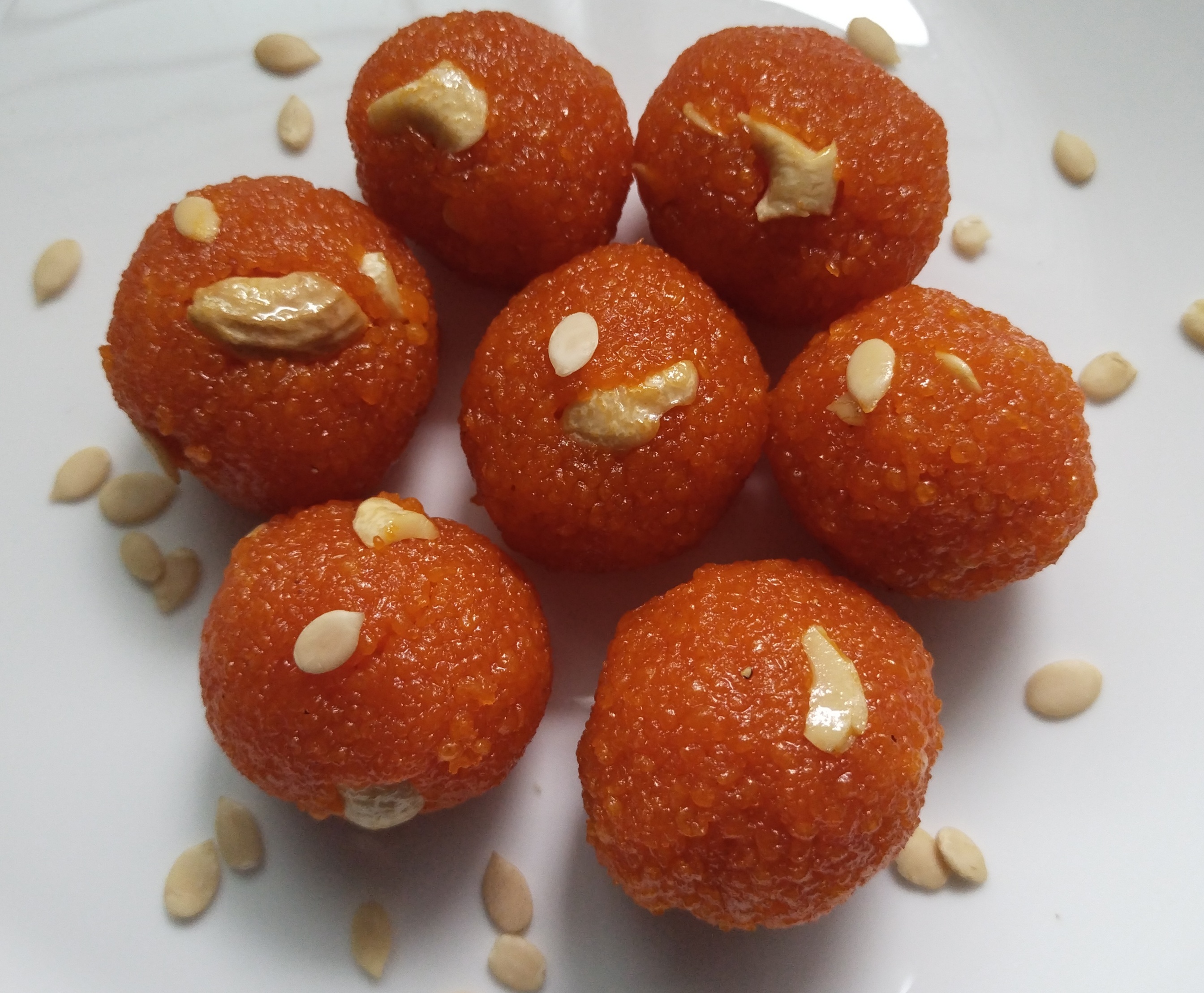 Once the mixture has cool down after 10 mins, sugar syrup is absorbed completely add chopped cashew nuts optional and 2 tbsp watermelon seeds mix well. you can see the the mixture is dried and all the sugar syrup has absorbed.๐โโ๏ธ If feel dry required u can add few tbsp of sugar syrup.. before we take them out in a bowl .prepare the ladoo take a small portion of boondi mixture. roll between ur palmsโto make .Finally Enjoy Motichoor Laddo is Ready To Served .You can Refrigerate for 1 week ..