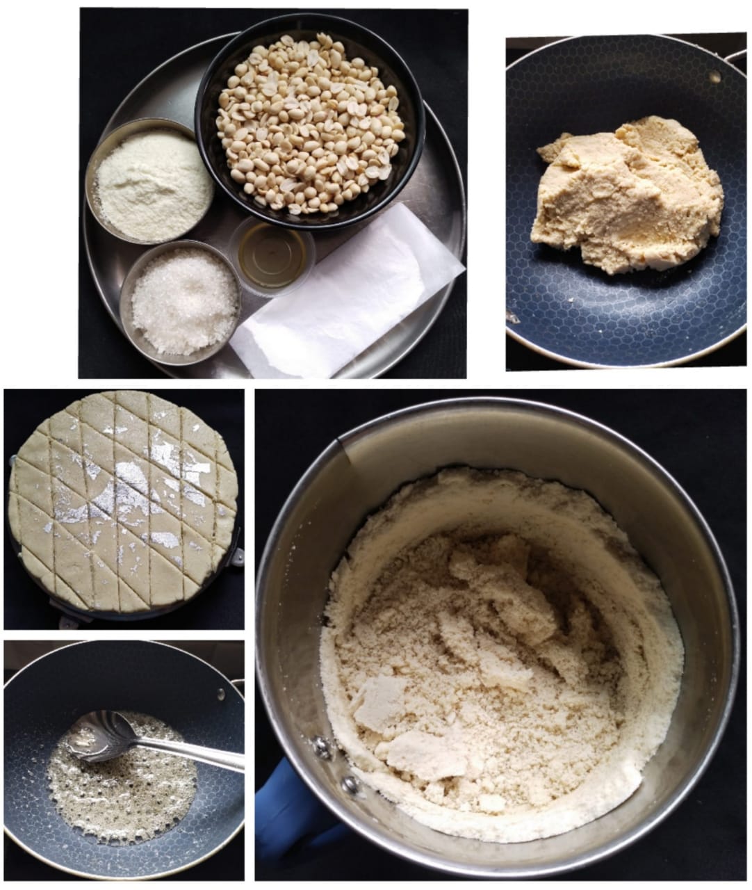 Take a kadai 1/4 cup sugar, add ๐ง1/4 cup water, give nice boil while getting sugar thick single line sugar thread now add Peanuts power & milk powder mix it nicely nearly 3 to 5 mins, add some ghee mix it well apply.Once done take a plate spread little ghee over the plate.