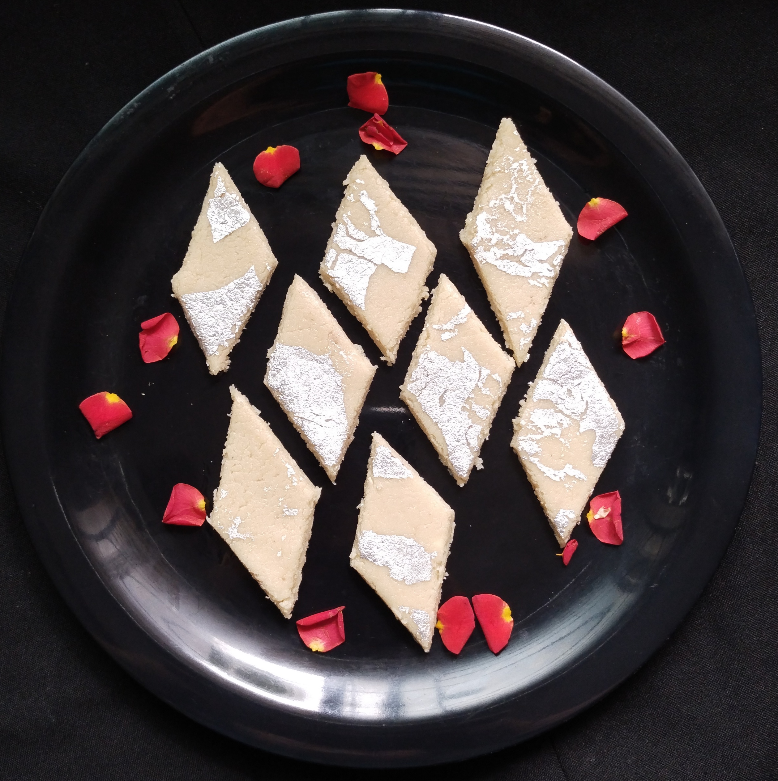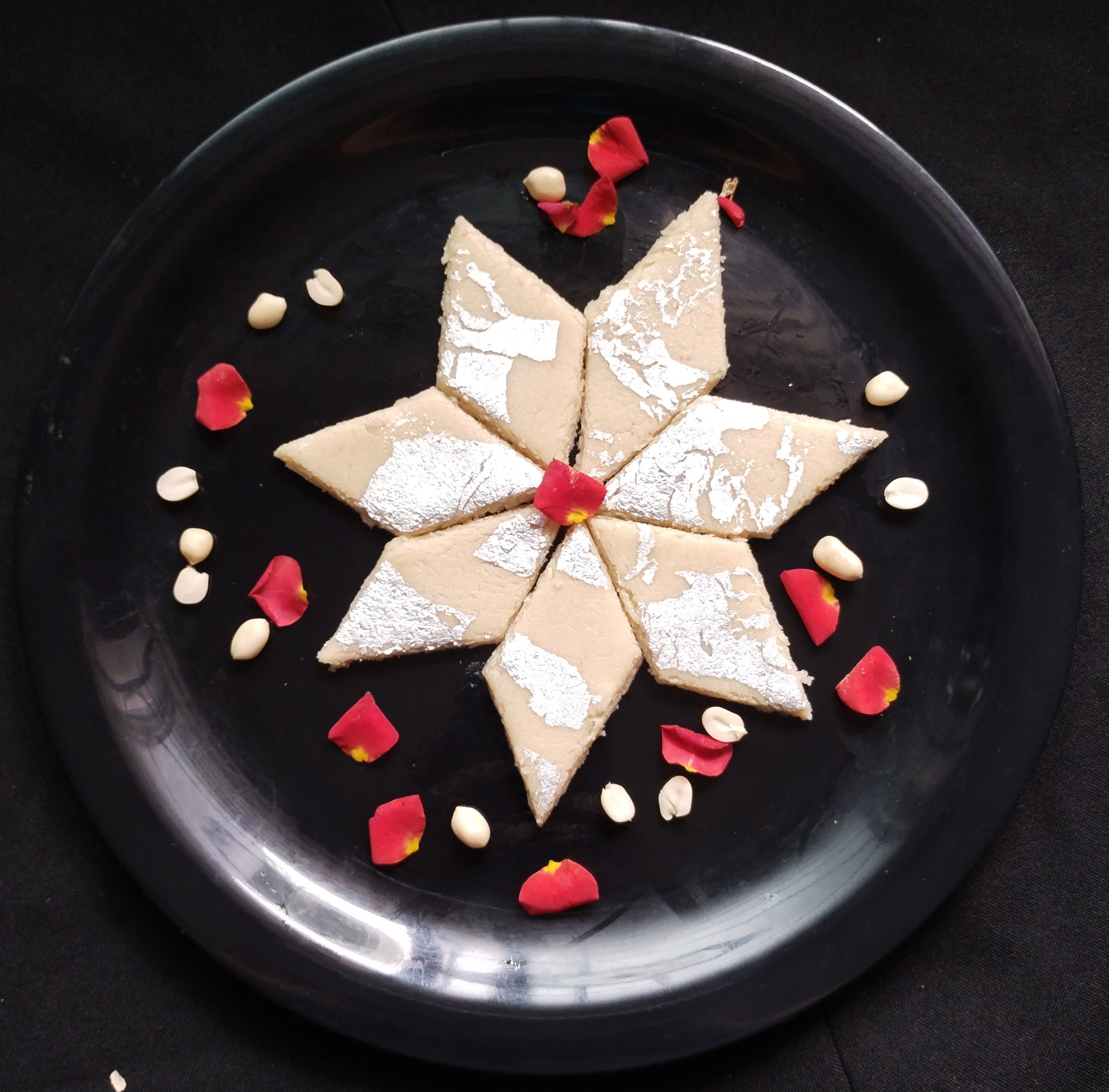 Now take rolling pin side press & make round .. little think Like chapati . and then spread the Barfi mixture evenly but little thick.Now cut into small square or any shape with knife.Garnish Once cooled Add sheet silver foil optional. They are Ready To Enjoy Peanut Barfi. ๐๐๐