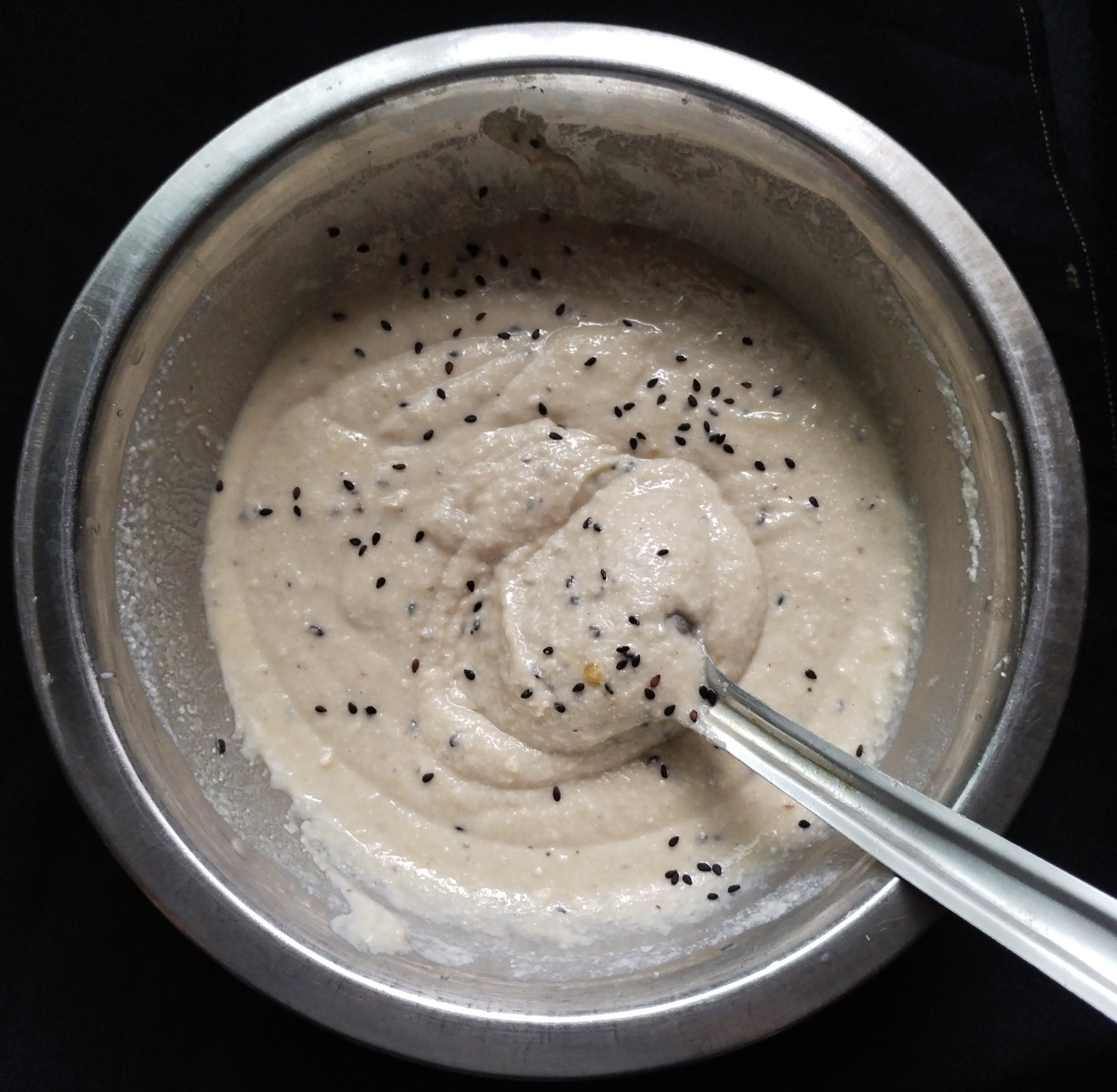 Now add Wheat flour , Rava , coconut & Ripe bananas ๐๐Mashed mix well add little by little milk without lumps.The batter is little thick ๐but dropping idli consistency . Then add pinch ๐คbaking soda , little salt, Black sesame seeds ,cardamom powder. Batter is ready to prepare.