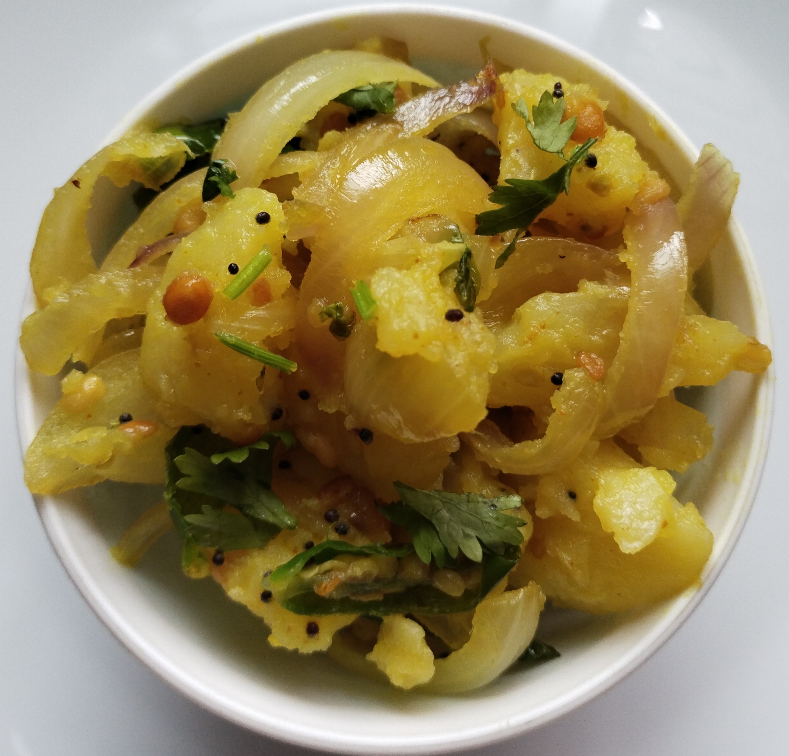 Heat oil in a pan add mustard. Curry leaves πΏlittle chana dal, urad dal chopped 6 to 8 green chilliesβ¦saute then add chopped onion.do not fry to long time we need crunchy onion add haldi powder.add little salt now add cooked potatoes smashed it should be in to small pieces add fresh coriander leaves mix it well cover and cook for few more mins.. Ready to serve Potato Bhaji.