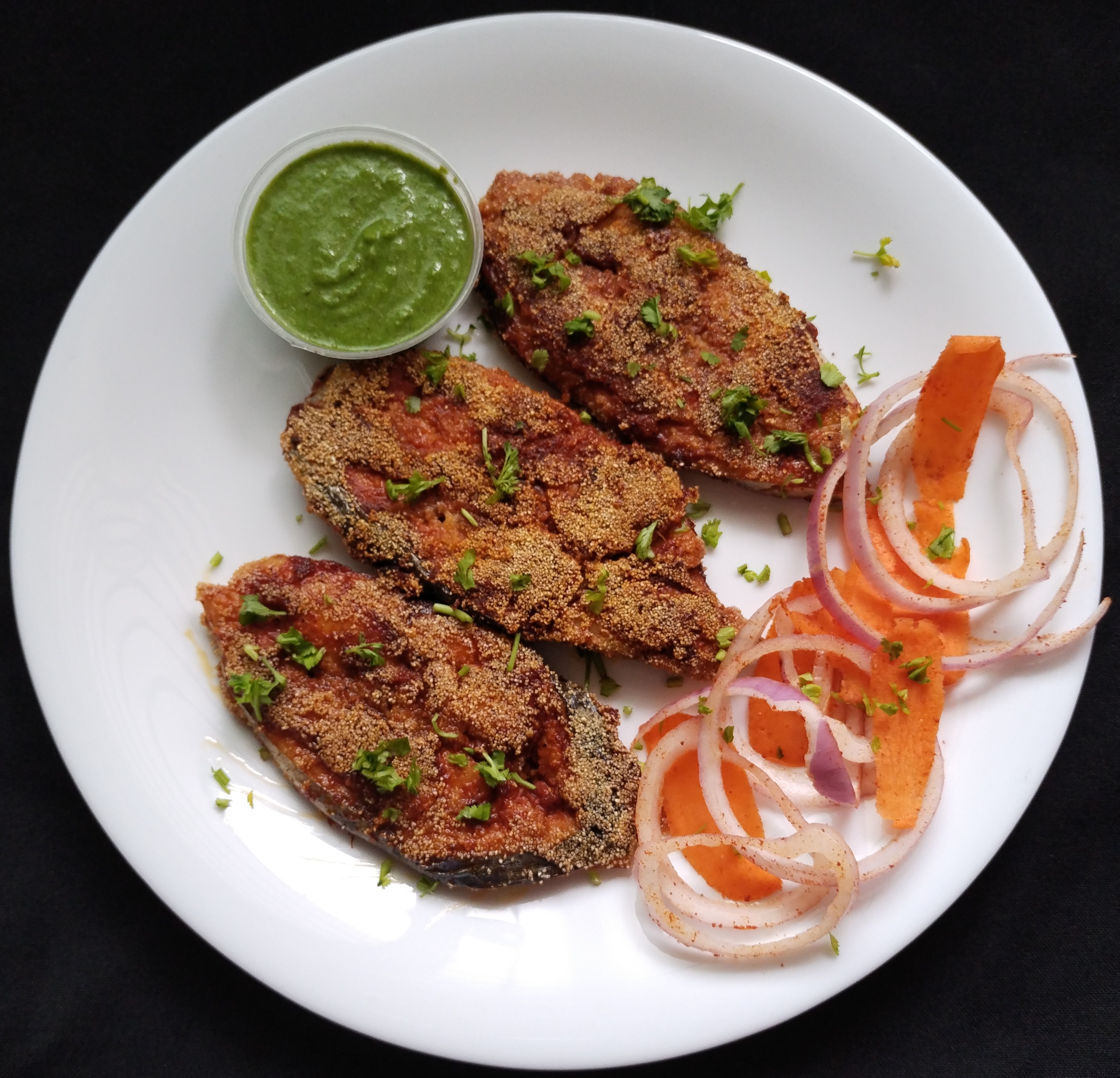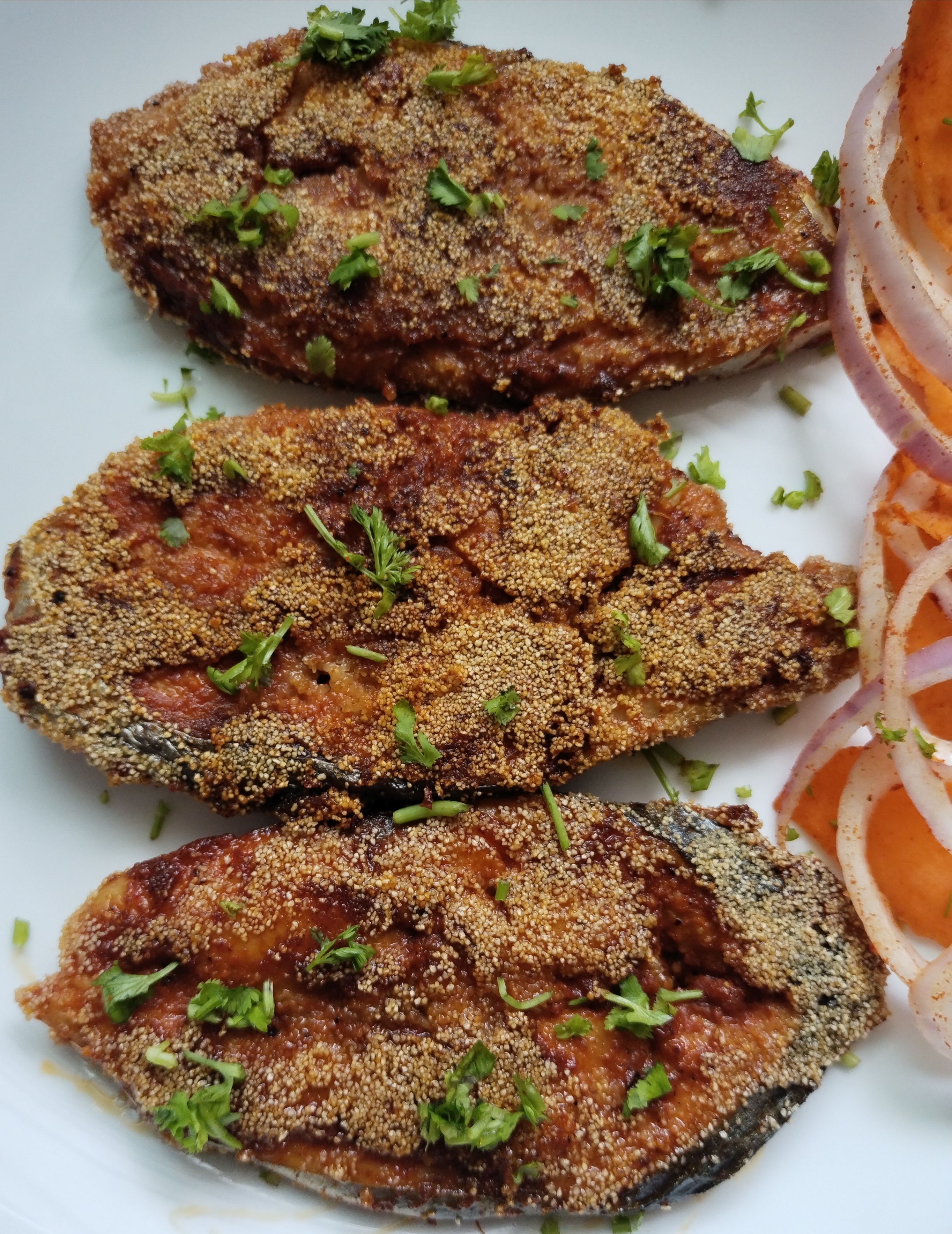 Anjal /King Fish /Surmai / Vison Tawa Rava Fry ๐Some Crunchy ๐ง ๐ฅOnions ๐ฅCarrot Salad & Spicy Green Chutney Dip..