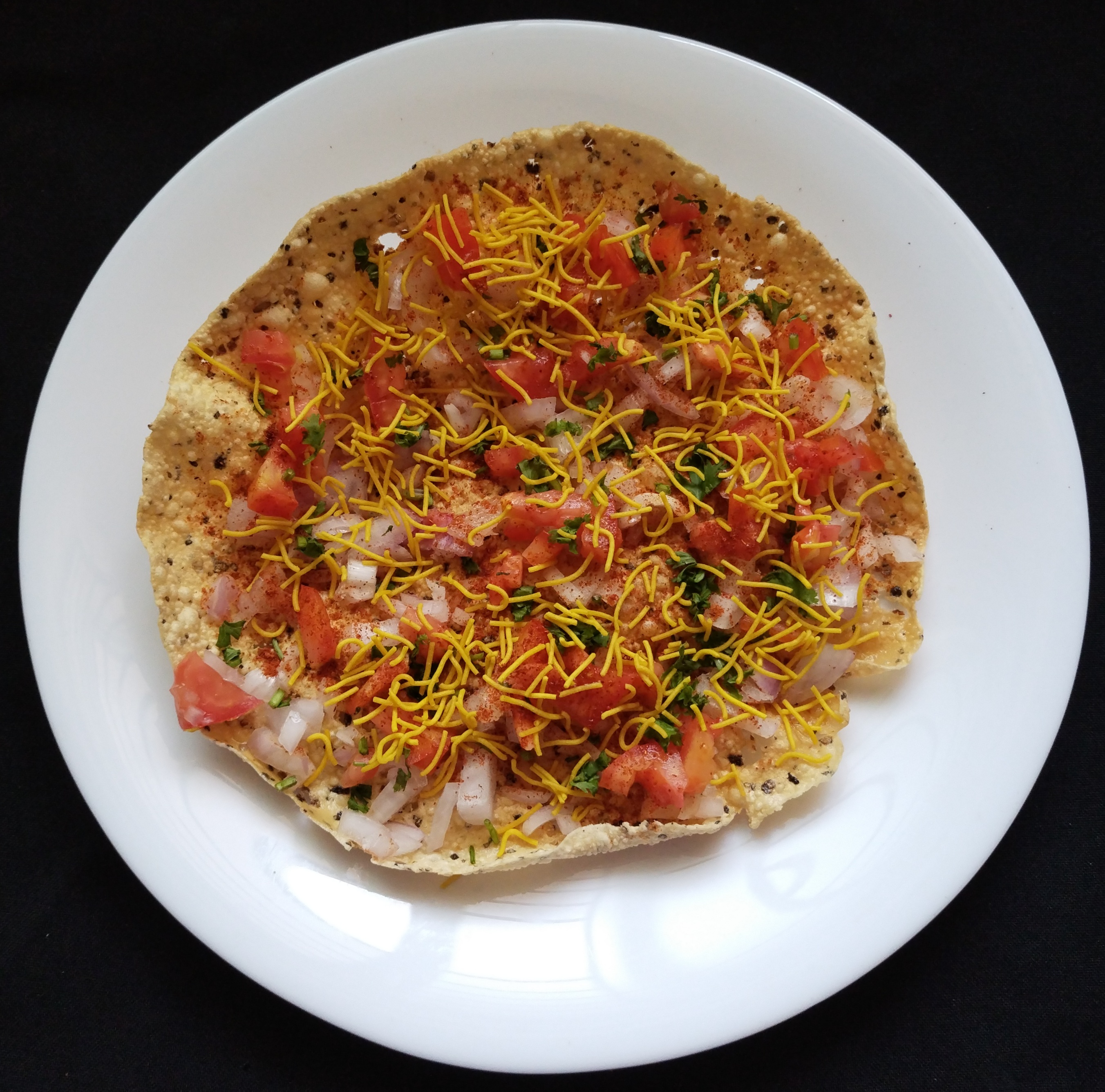 Sprinkle pinch 🤏 red chilli powder for base Papad to get extra spicy 🔥😋 now add chopped onions, tomatoes & Coriander leaves.. sprinkle Sev & chat masala again sprinkle red chilli powder 💁adjust the quantity as per your like & taste. At the end sprinkle lemon 🍋 juice also as per your taste.Serve immediately or else they turn 💁soggy.