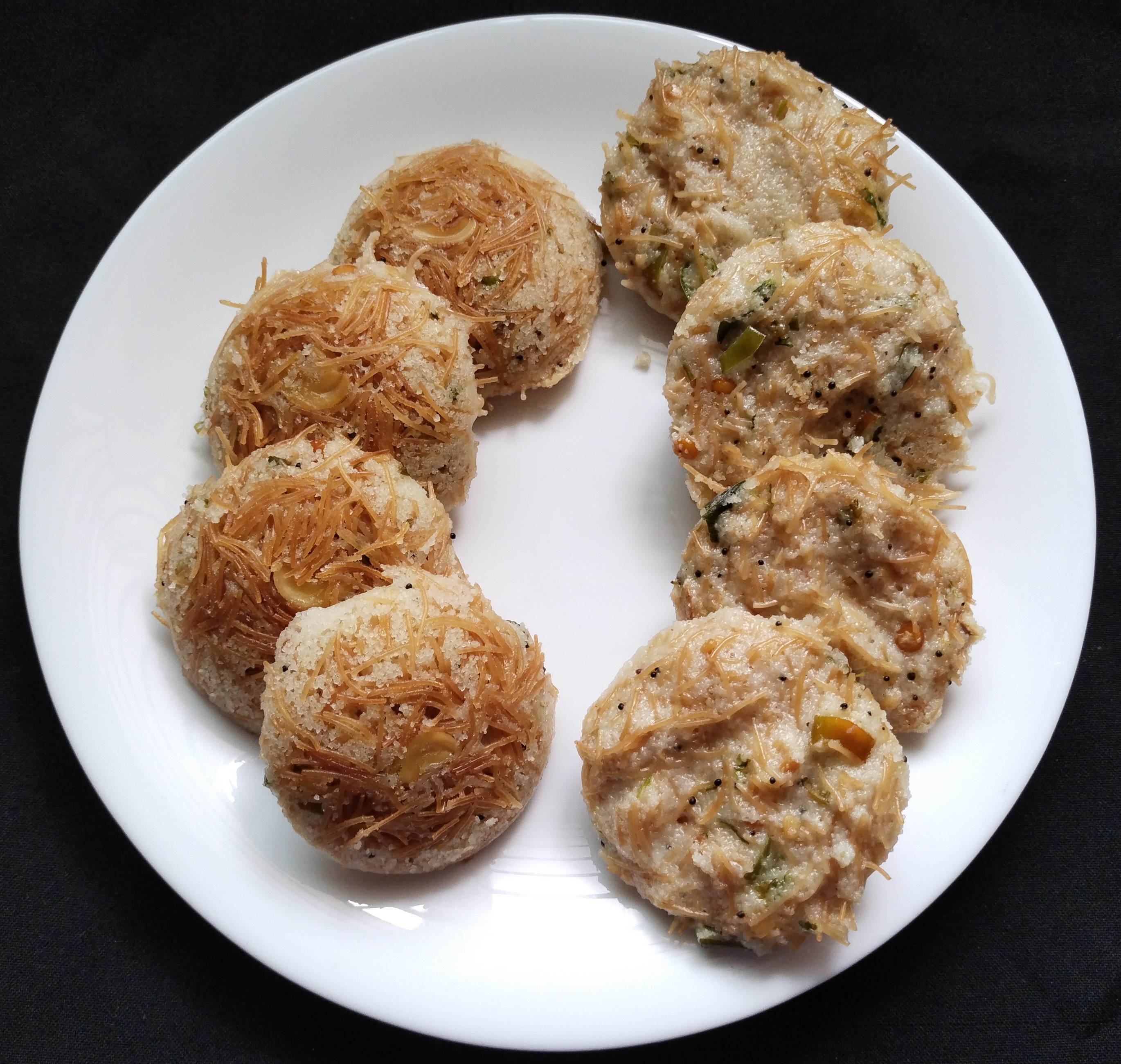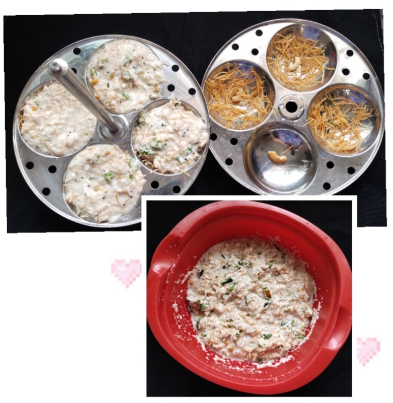 Place a cashew nut and some roasted vermicelli in the idli moulds, then pour the batter into the moulds.It makes the idli look more beautiful and appetising. A sure hit with kids.