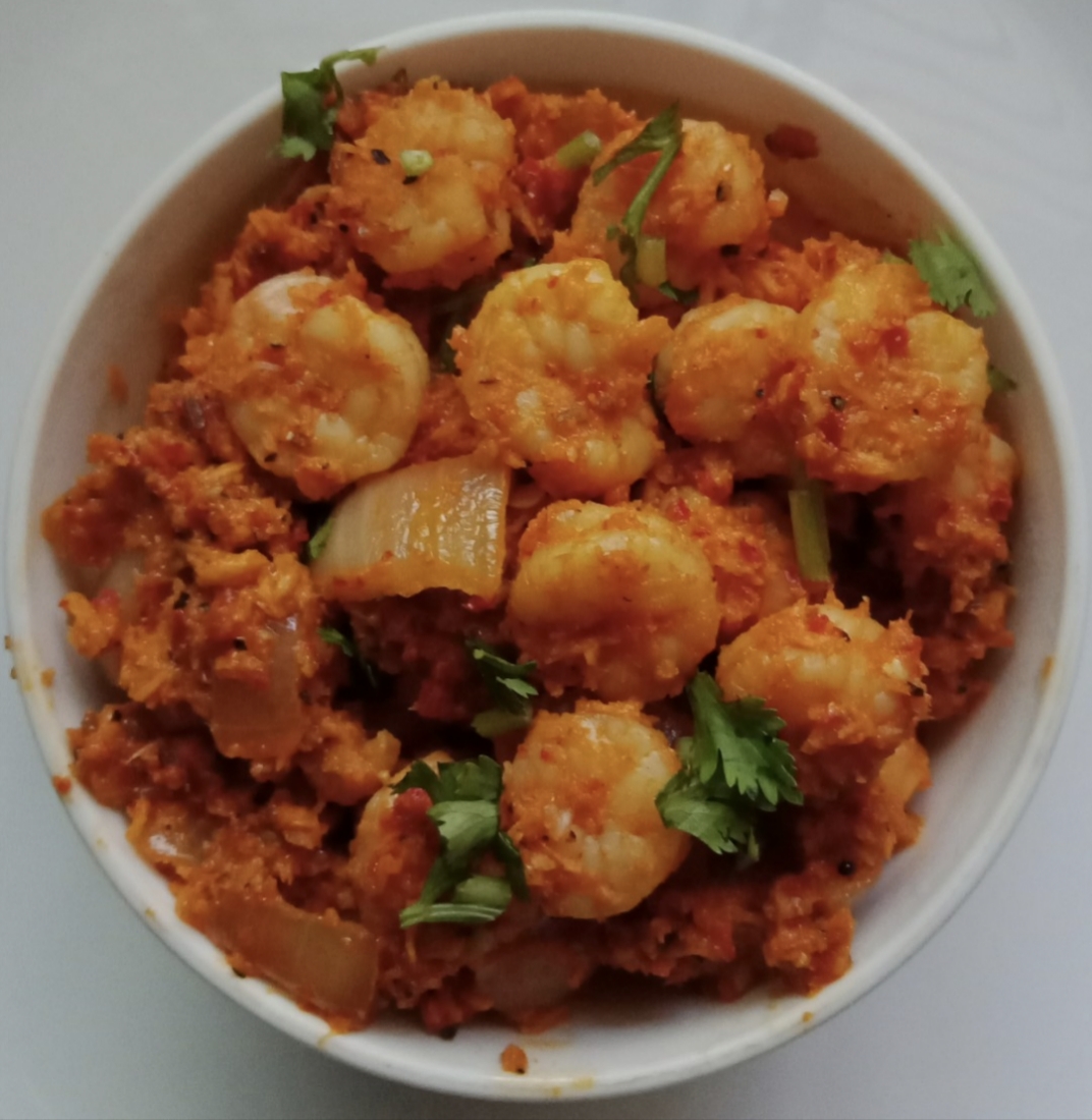 Heat a kadai add 2 tbsp oil now add finally chopped Onions Saute until onions are translucent. Add prepared coarse masala paste.Cook it for 10 min with covered lid . After its almost cooked, masala …Then add cooked prawns and salt if needed Cook it for 2 more min.When it’s done garnish with fresh coriander leaves.Ready to Serve Prawns Sukka… 😋🤗🤤