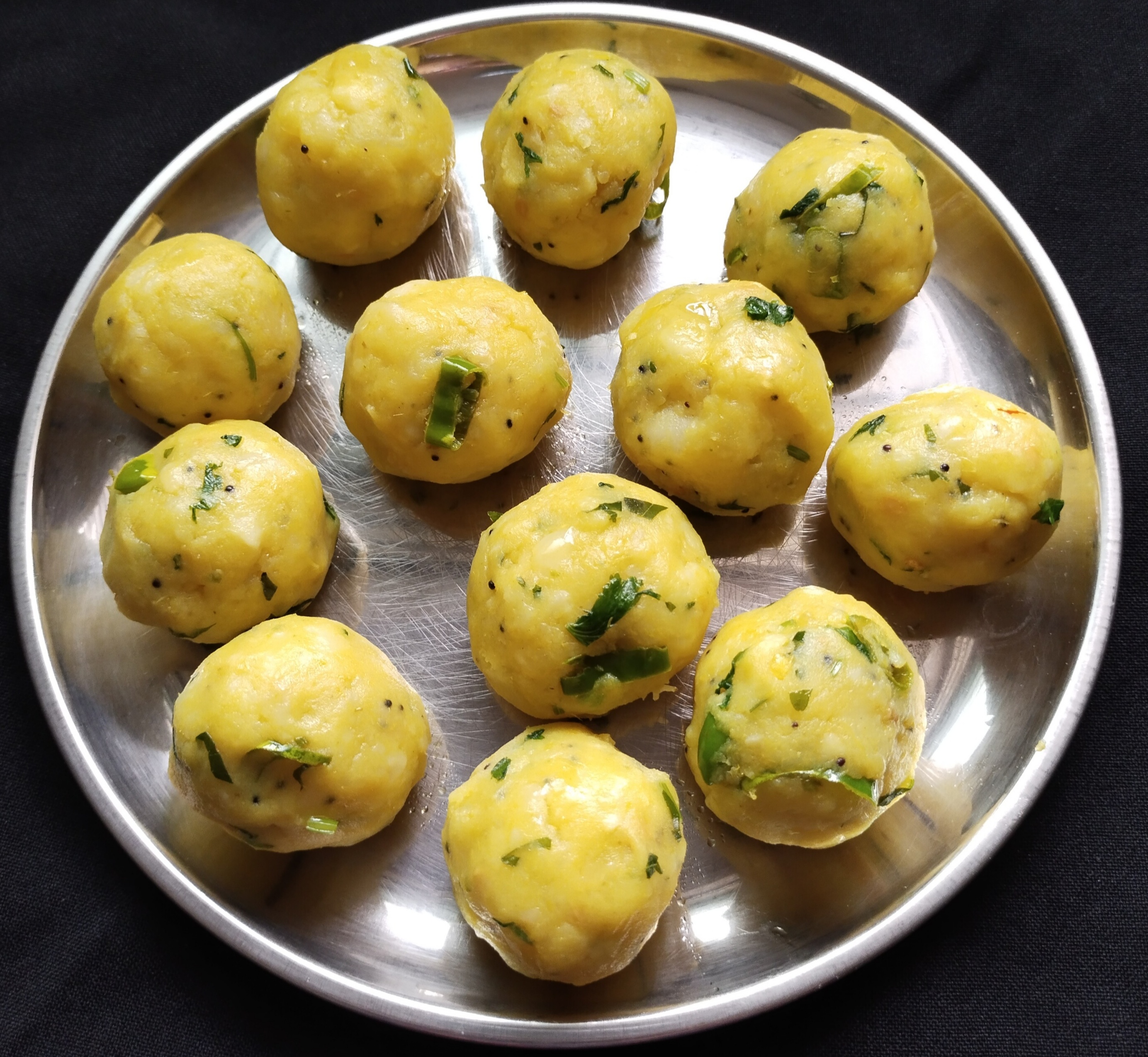 Boil the potatoes with the skin until tender in enough water so as to completely immerse the potatoes.. When done, drain the water, let the potatoes cool completely. Peel the cooled potatoes, mash it thoroughly in a bowl. The batter should be thick enough to shape it into balls. Add salt, green chillies, coriander leaves,curry leaves, ginger, and freshly grated coconut and mix well.