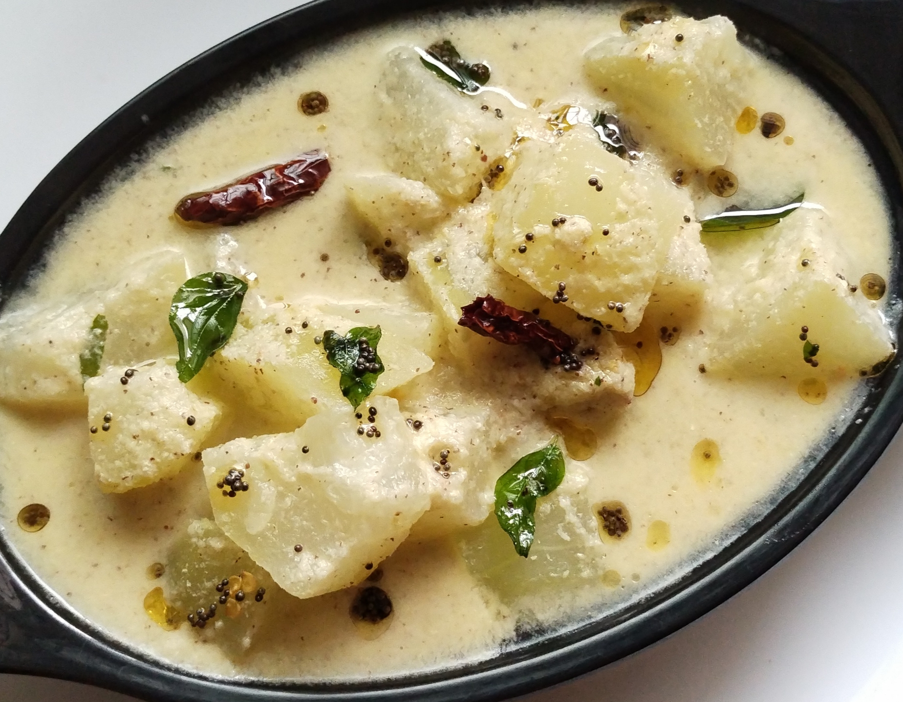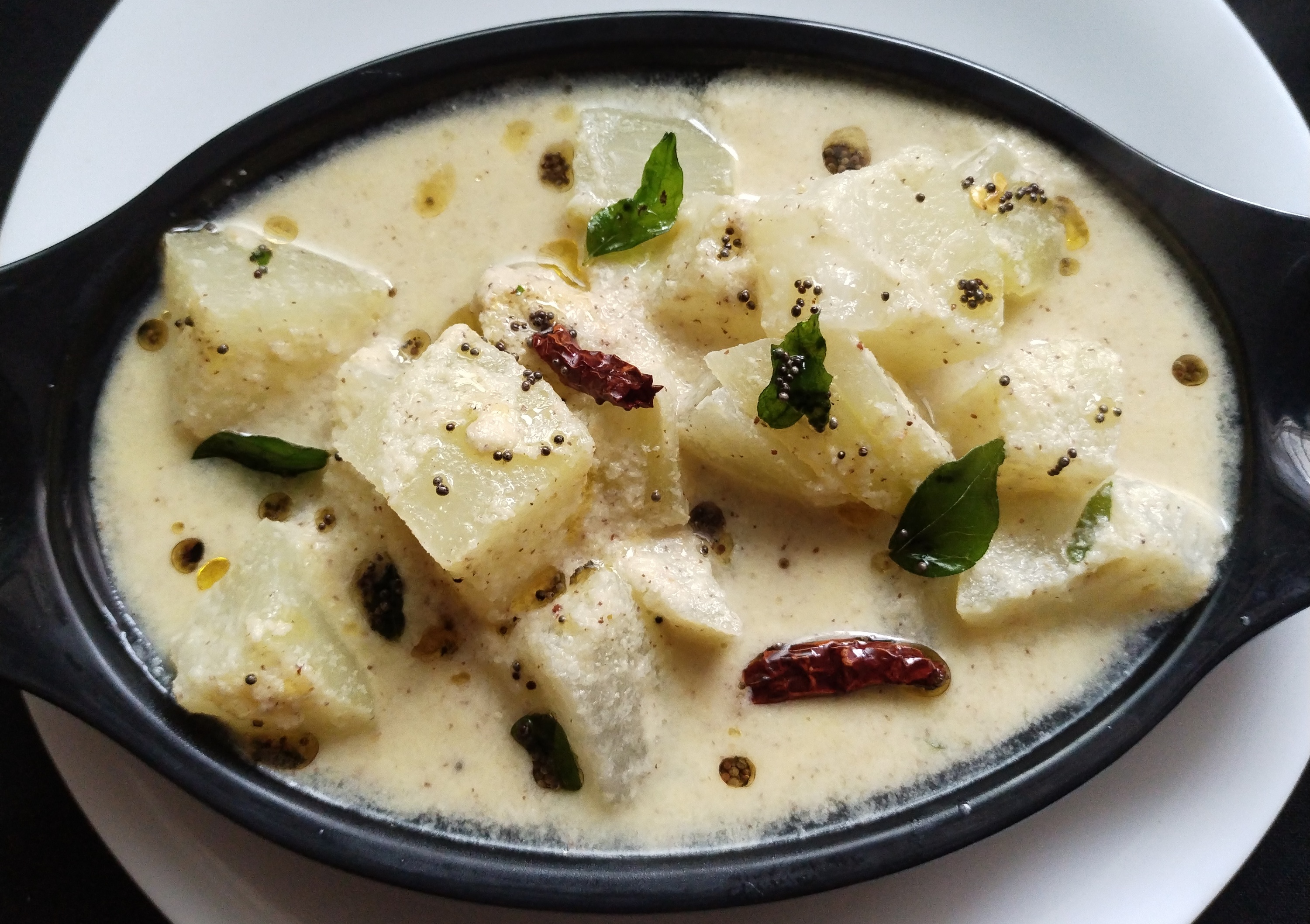 Add this masala to the cooked Ash gourd in a cooking vessel and bring to boil. if necessary add water to maintain a medium thick consistency, bring it to boil Simmer for few minutes and remove off the heat.