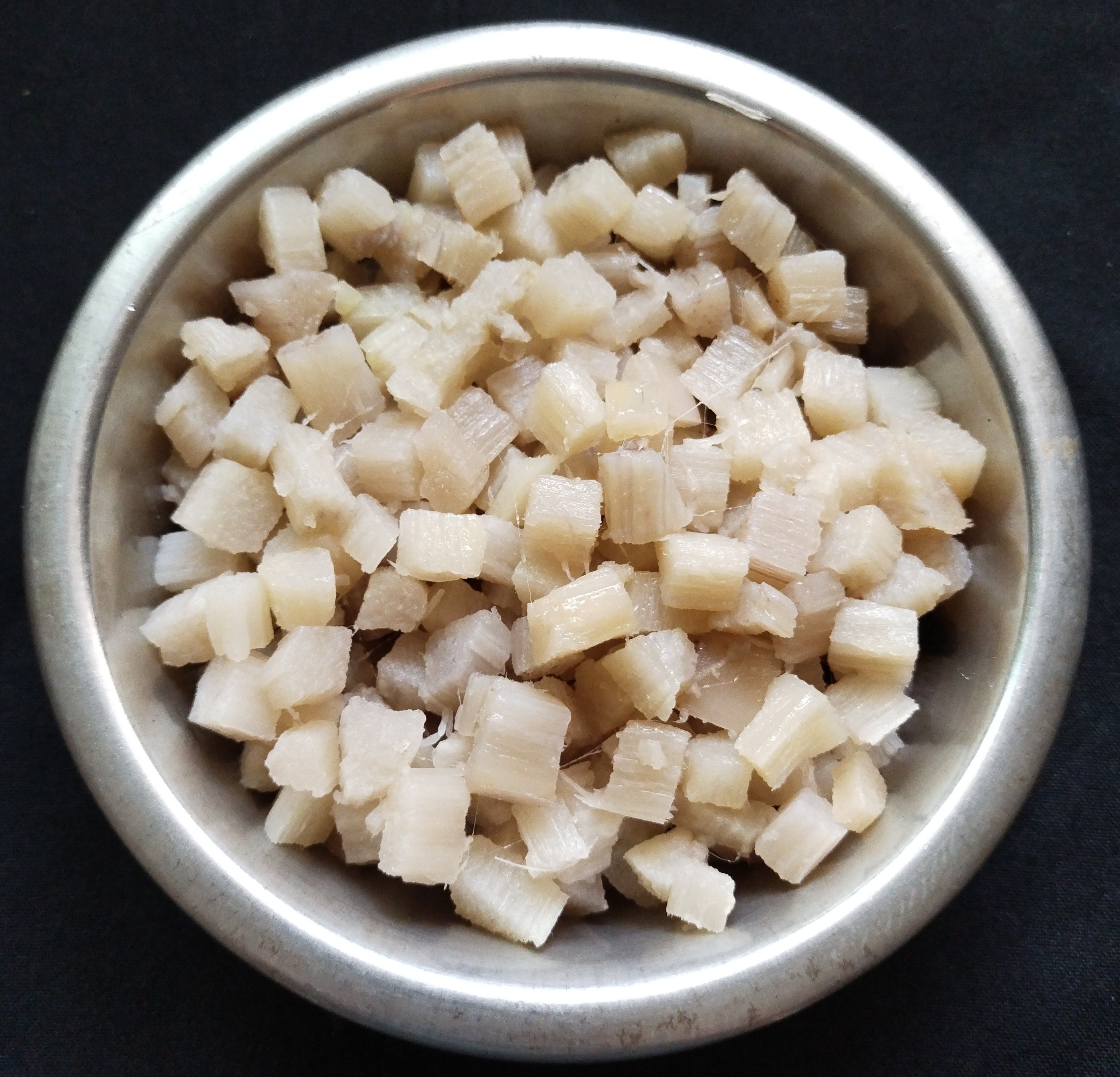 Cut a medium sized banana stem into roundels. Remove the excess fibre. Chop them cubes.