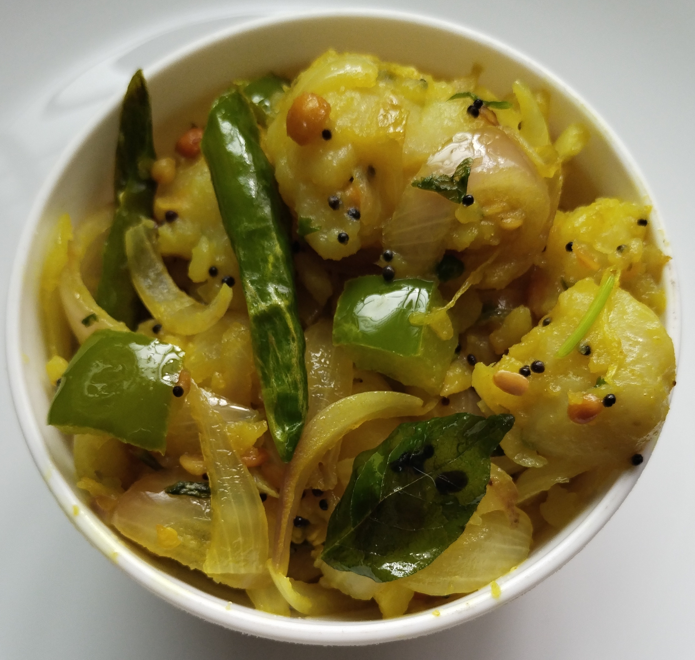 Heat oil in a pan add mustard. Curry leaves 🌿little chana dal, urad dal ,chopped green chillies…saute then add chopped onion & capsicum saute nicely. add haldi powder, little salt now add cooked potatoes smashed it should be in to small pieces add fresh coriander leaves mix it well cover and cook for some few mins.. ready to serve With dosa .