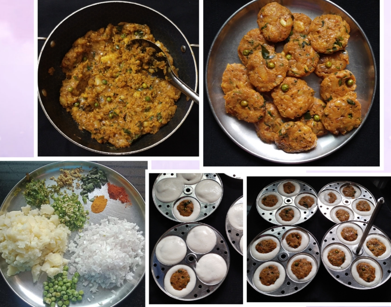 Now grease the idli plate mould and then pour a 1/2 half laddle of batter and spread evenly. Now add a masala mixture of cutlet shape place it and drop π§ over the idli batter and then again drop the idly batter over the filling and close it.steam the idli for 15 mins ..βTake out the idli once it completely done. and Ready to Serve it Ur Choice of Chutney or Tomato π Sauce β¦πππ