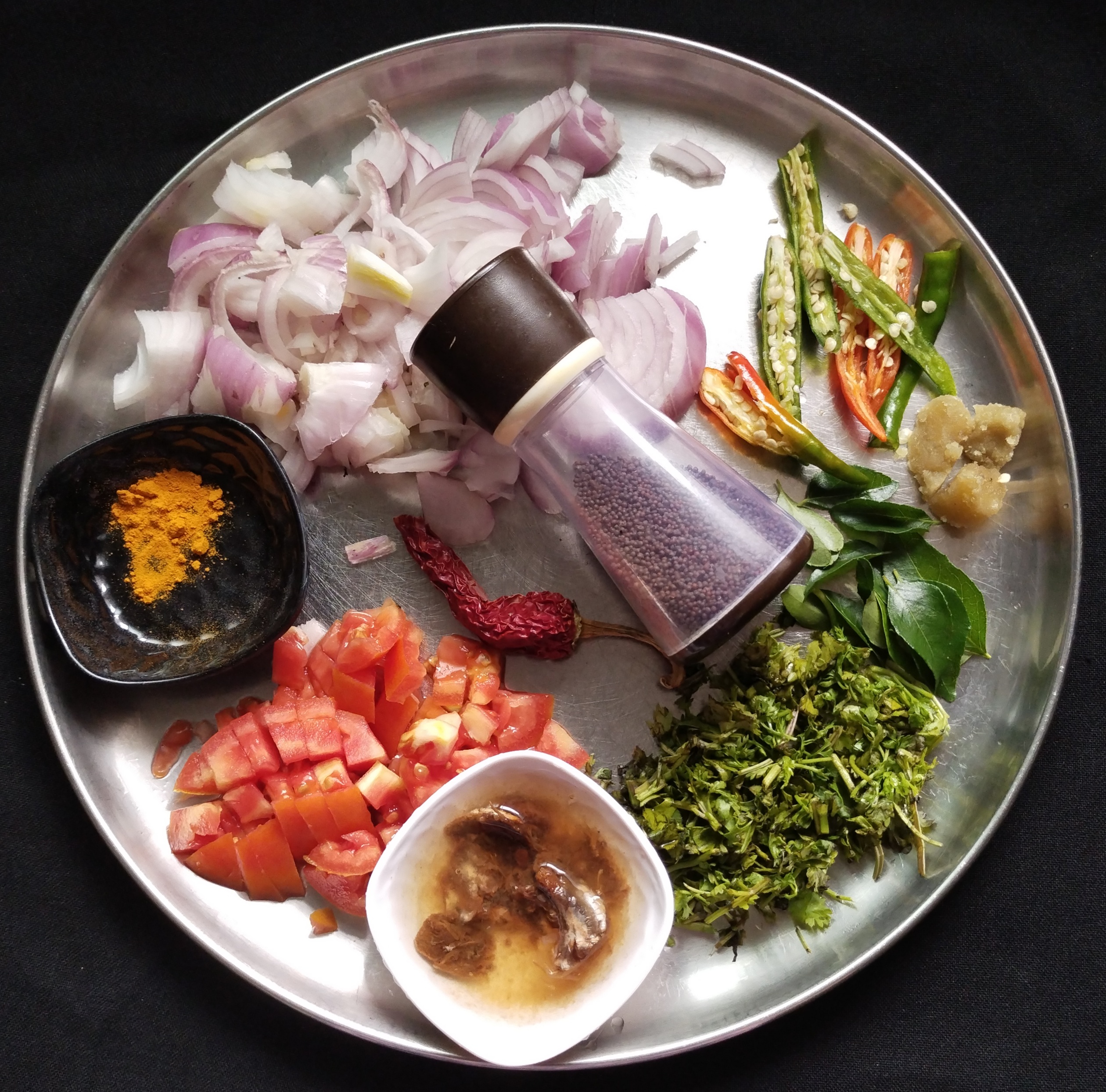 In a kadai heat 3 tbsp oil add mustard seeds & few curry leaves & slit green chillies splutter the tempering.Now add onions Saute it for 2 mins.add tomatoes Saute for few mins.add turmeric powder, salt to taste.