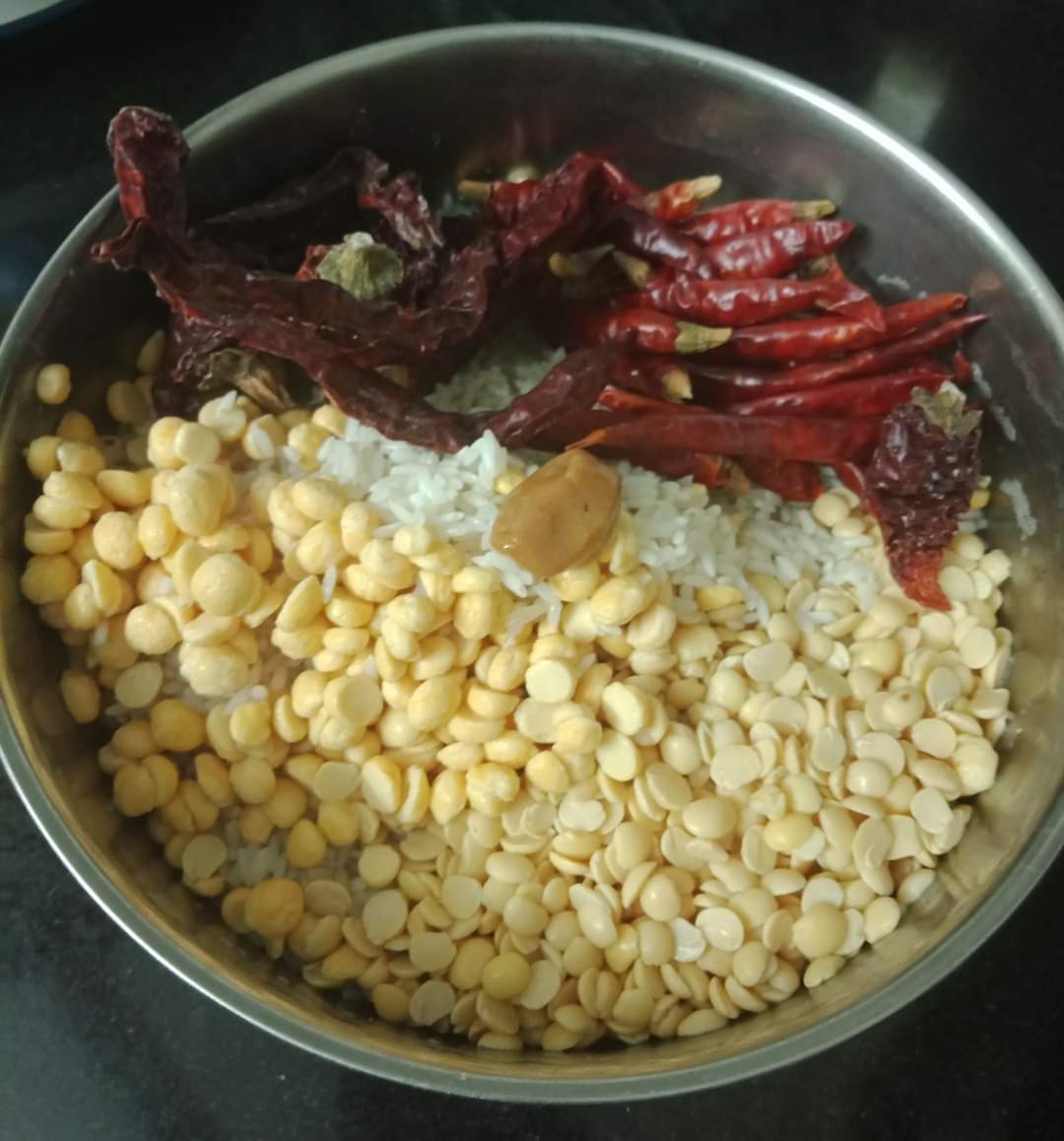 Then grind it along with grated coconut & red chillies to paste 👉coarsely adding very little water. The consistency of the batter should be a 💁little thicker than the normal dosa batter.