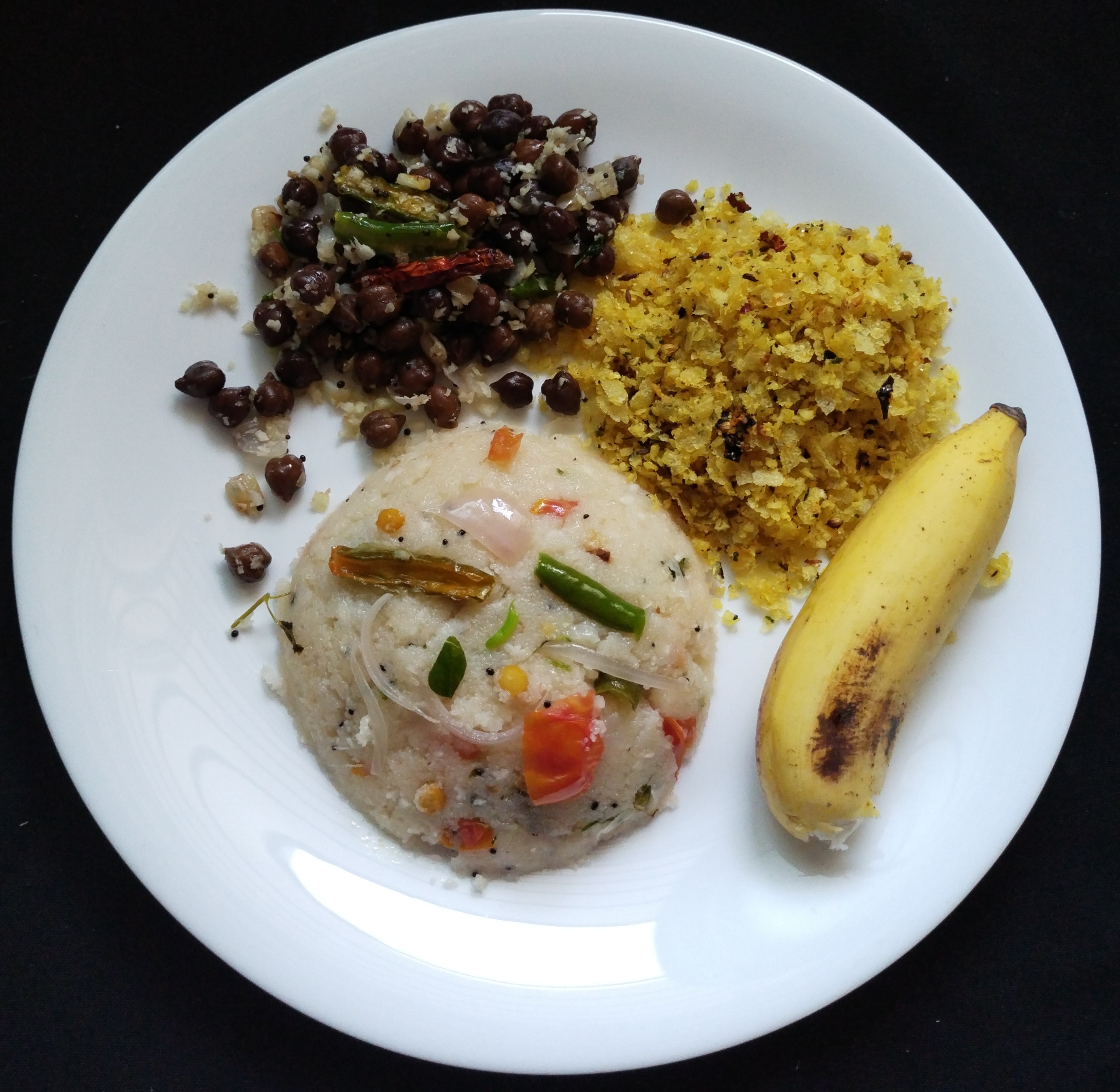 Poha Chutney ,Chana Usli & Simple Upma Healthy Traditional Breakfast Combo With Banana 🍌 & Hot Cup of Coffee ☕ Lovely Combination… 💖😘😋😋