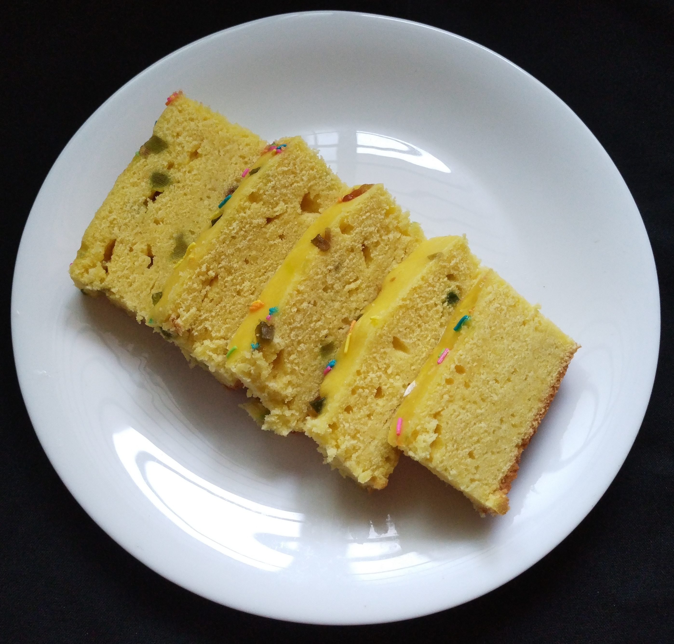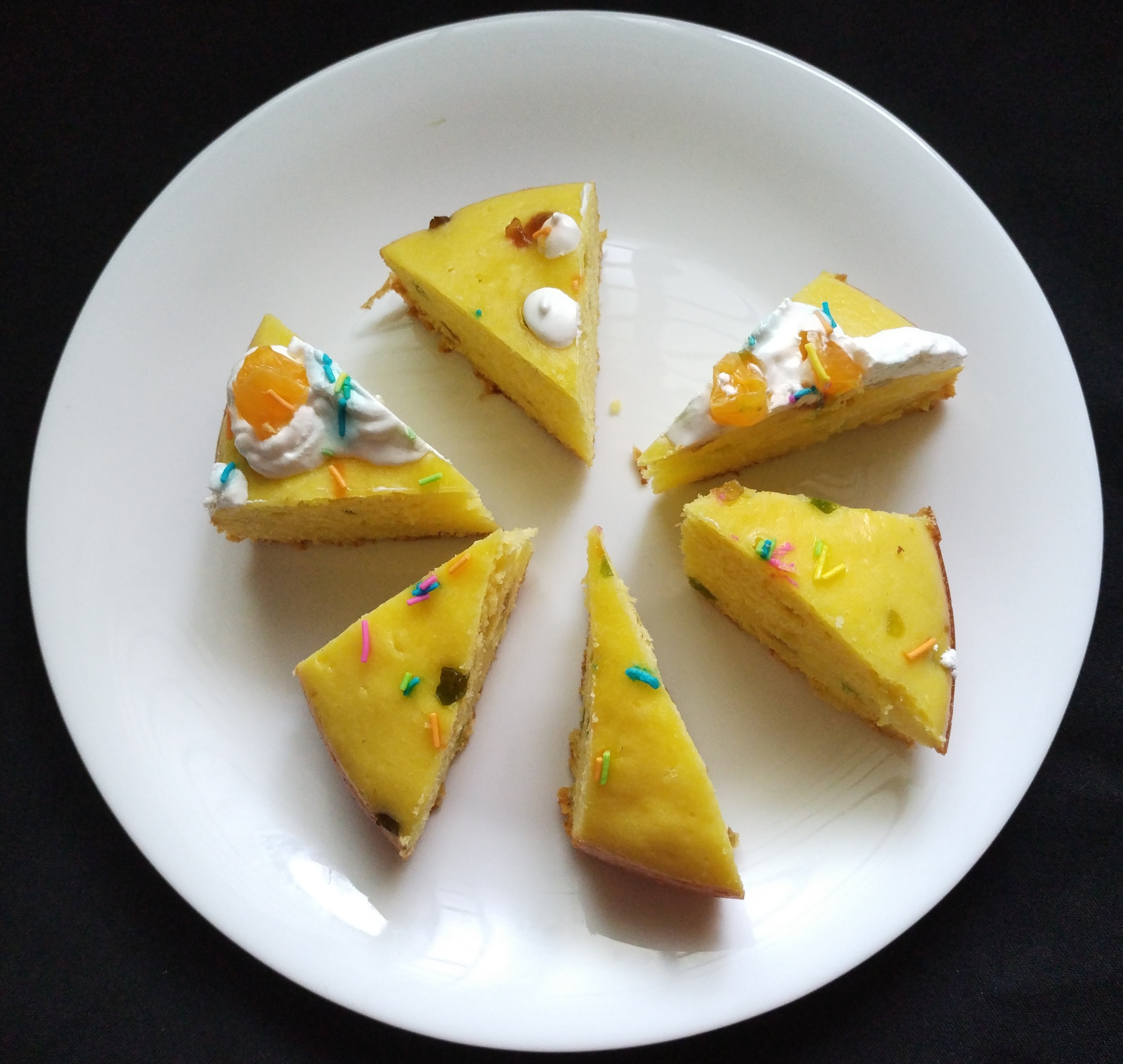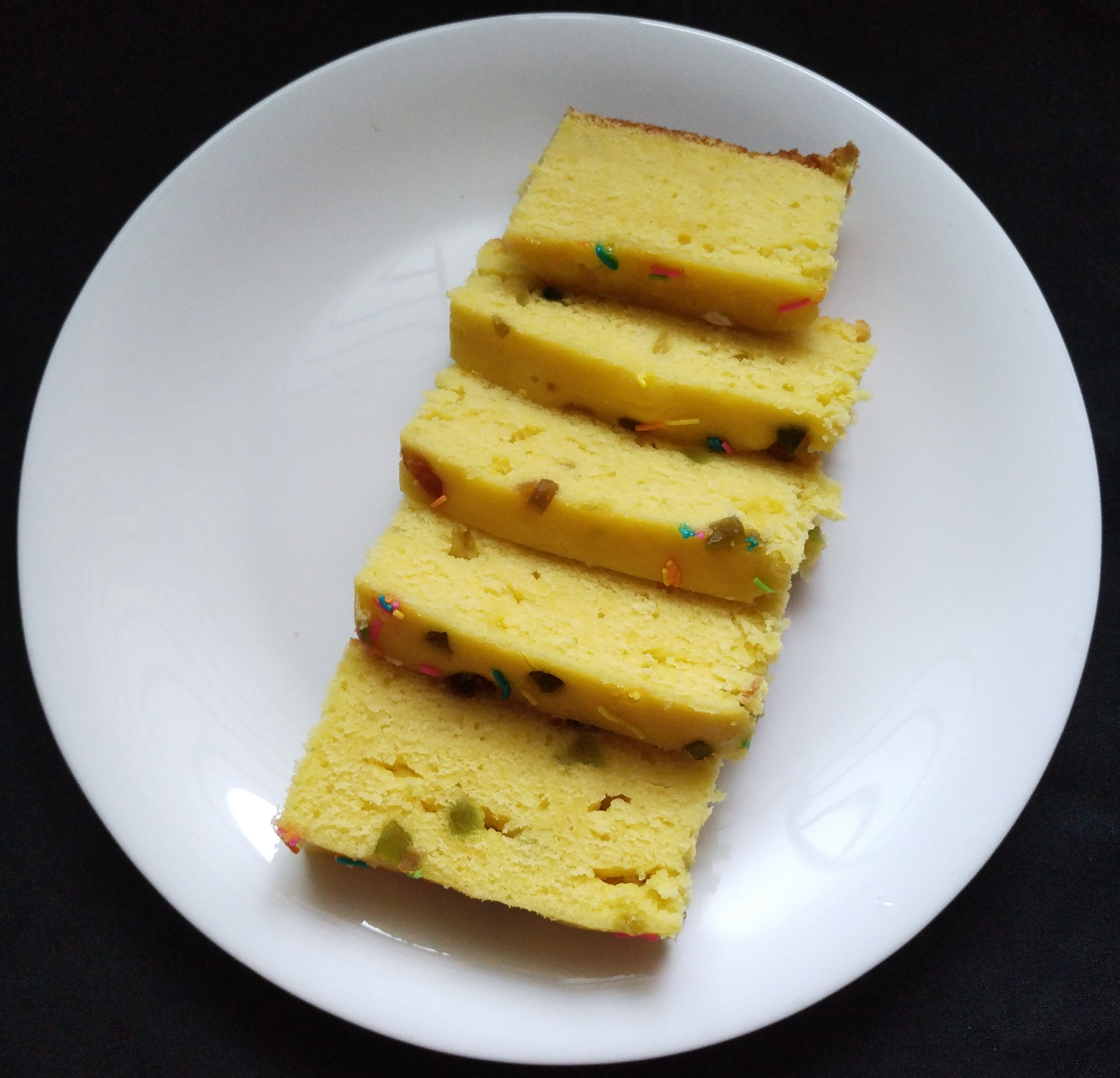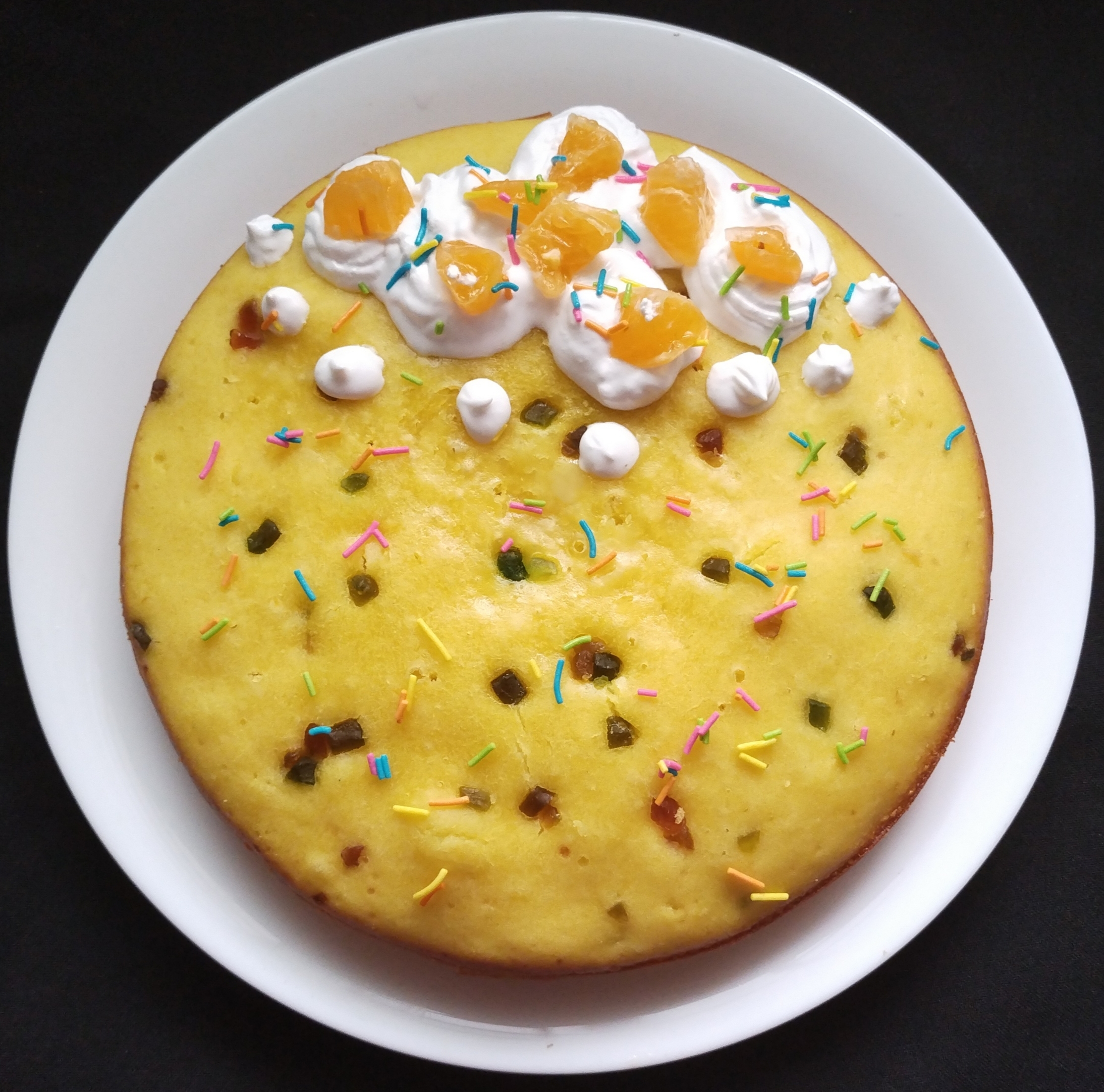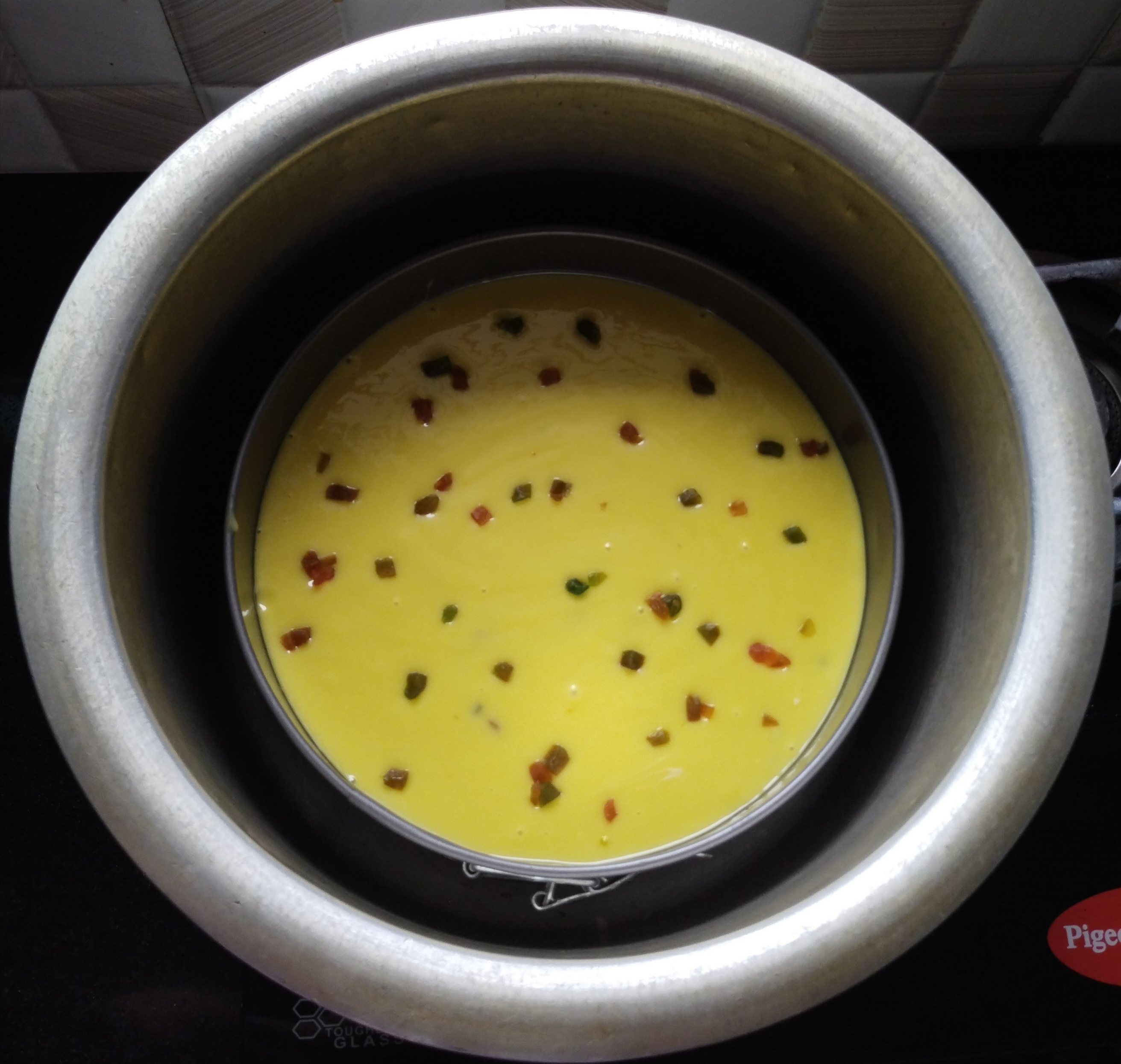 Now take a all colours little Tutti Frutti mix 1/2 tbsp maida mix well than add to batter There should be no lump in a batter.Transfer the batter to a greased cake tin tap it gently to remove air bubbles .Open the lid of the pan or the pressure cooker be carefully it will be hot.keep a hot pot stand inside it. put the cake tin over the stand close the preheated pan let it bake for 35 minutes on slow flame after 25mins check it once knife is clean removed from the cake Tin and let it cool down before demoulding… soft and spongy cake looking very beautiful #Orange_Cake is Ready… To serve With Chilled Cold Coffee…Hot cup of Tea. ☕