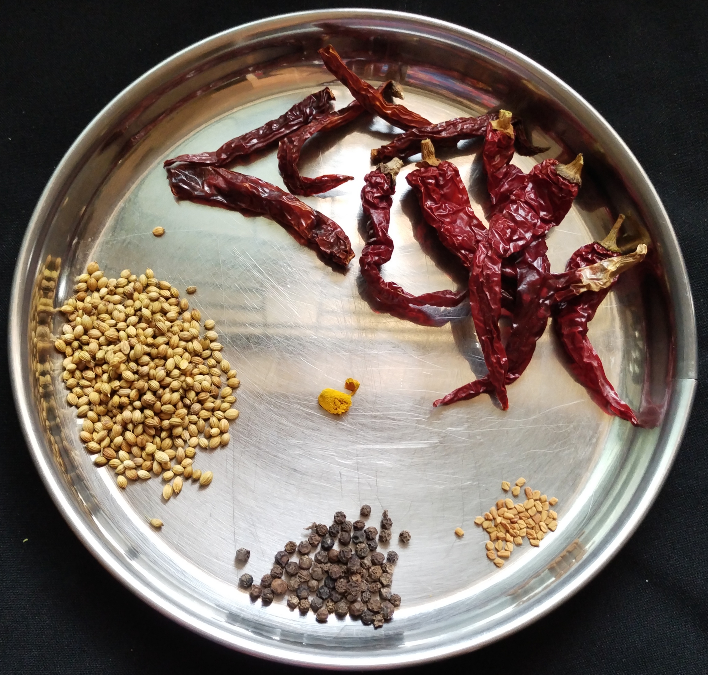 Take a pan, dry roast one by one ingredient red chilly, Coriander seeds, Methi/ fenugreek seeds,pepper corns,small piece of turmeric and the whole spices for about 5 minutes. Now allow to cool for sometime.