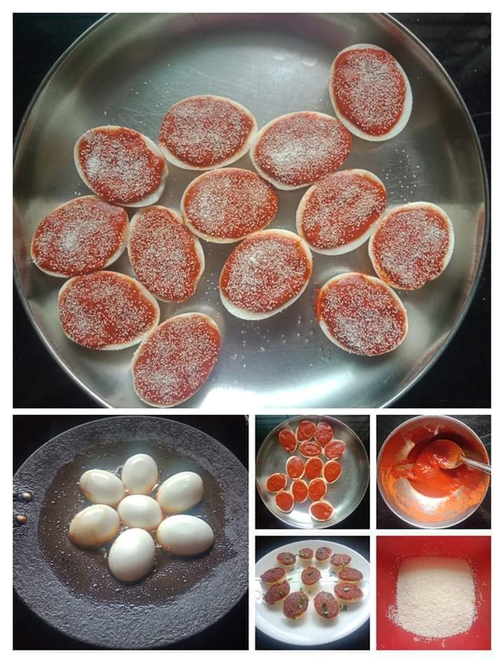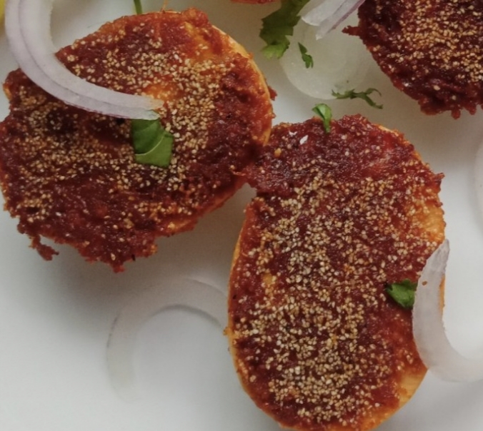 In a mixing bowl, add red chilli, turmeric powder, Coriander power & Asafoetida power required salt. Sprinkle a little water to make a pastešlike don’t add to much water we need thickĀ paste consistency šThen apply the masala paste eggs and Coat the masala on all the sides of the egg and marinate for at least 30 mins or hour āSprinkle rava top on the Eggs Masala paste…