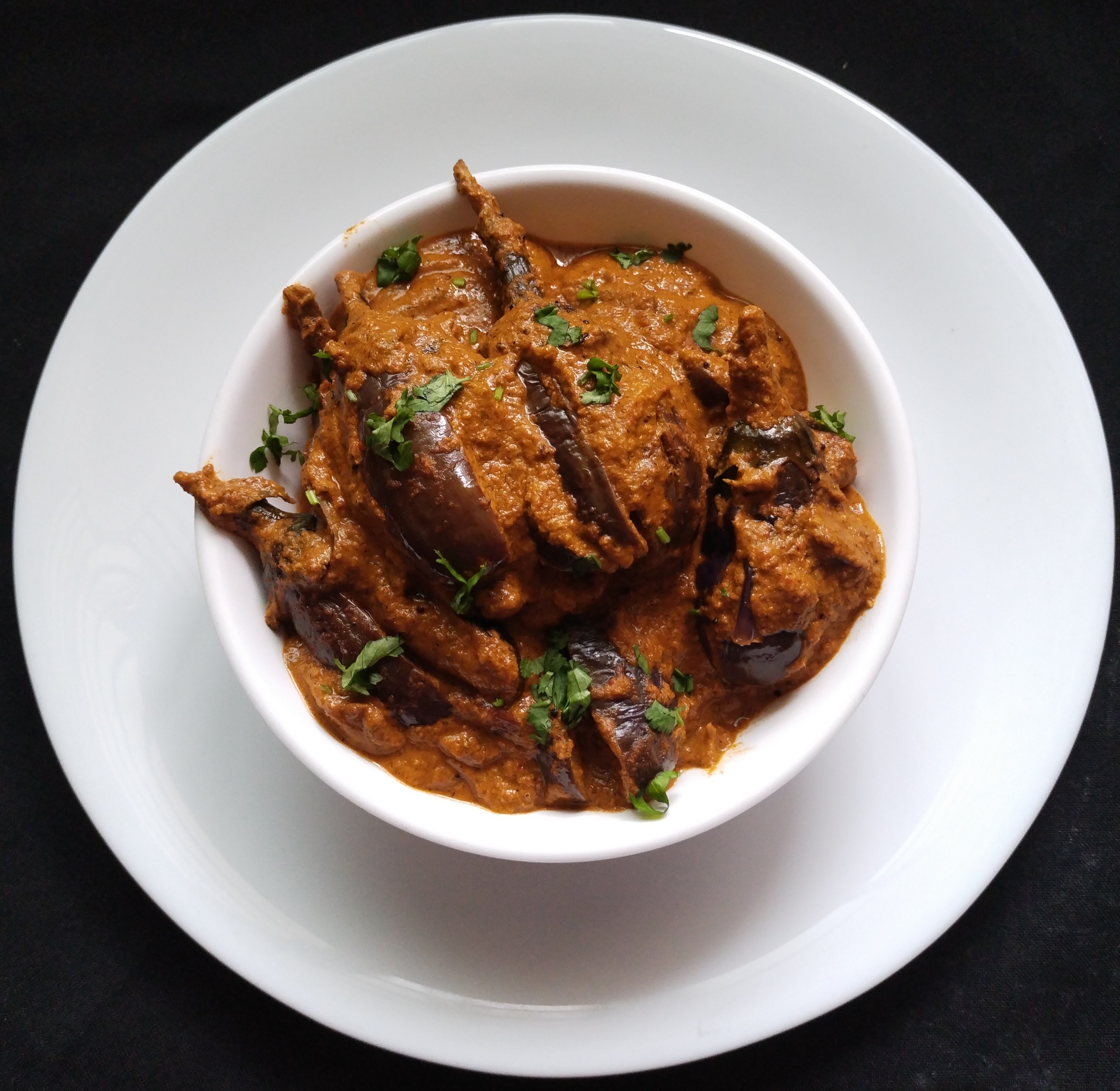 Take thick bottom kadai add 4 tbsp oil, mustard splutter than add curry leaves, jeera,Onions, turmeric powder, add 2 tomatoes 🍅 fry for 3 – 4 mins Saute nicely till tomato turn smashy.add now carefull place cut brinjal shallow fry for 5-8 mins while change colour , add the masala paste & some water and close the lid and check in between 5 mins cook in low flame nearly 8-10mins when Brinjal getting soft garnish with coriander leaves.