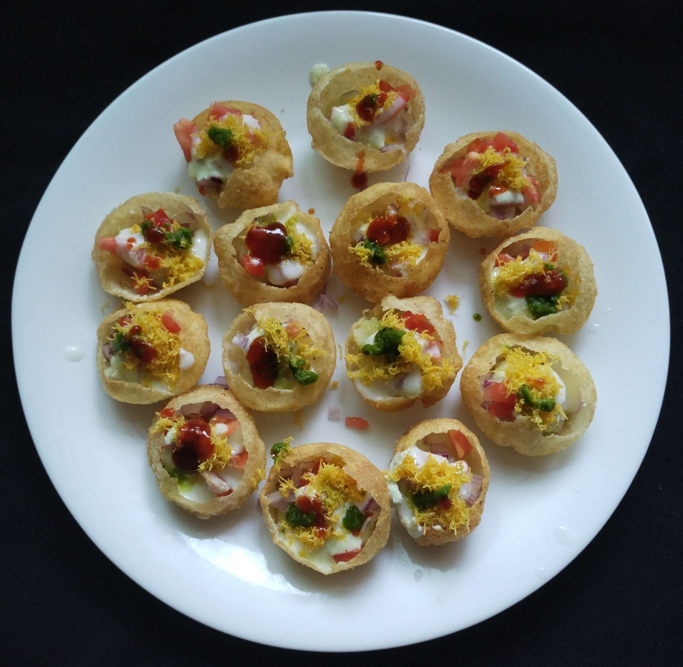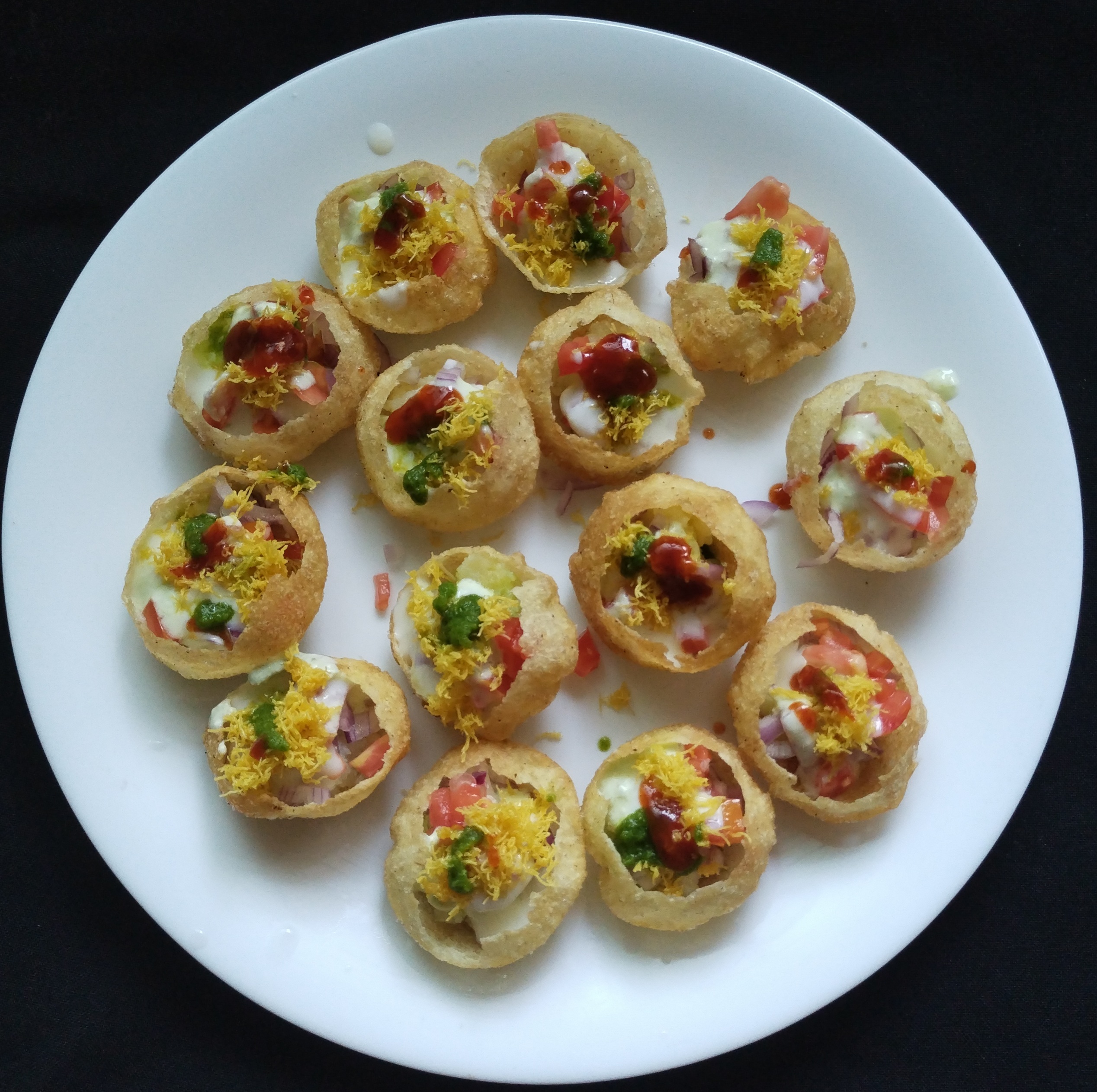 Arrange the puris in a plate.Put mashed potatoes mixture on each puri. add onions , tomatoes , green chutney and sweet chutney. Add 1tbsp sugar & 1 pinch salt for yoghurt mix well ,now put each puri 2tbsp curd… sprinkle sev and chaat masala optional. Garnish with Sev ready Serve Immediately….