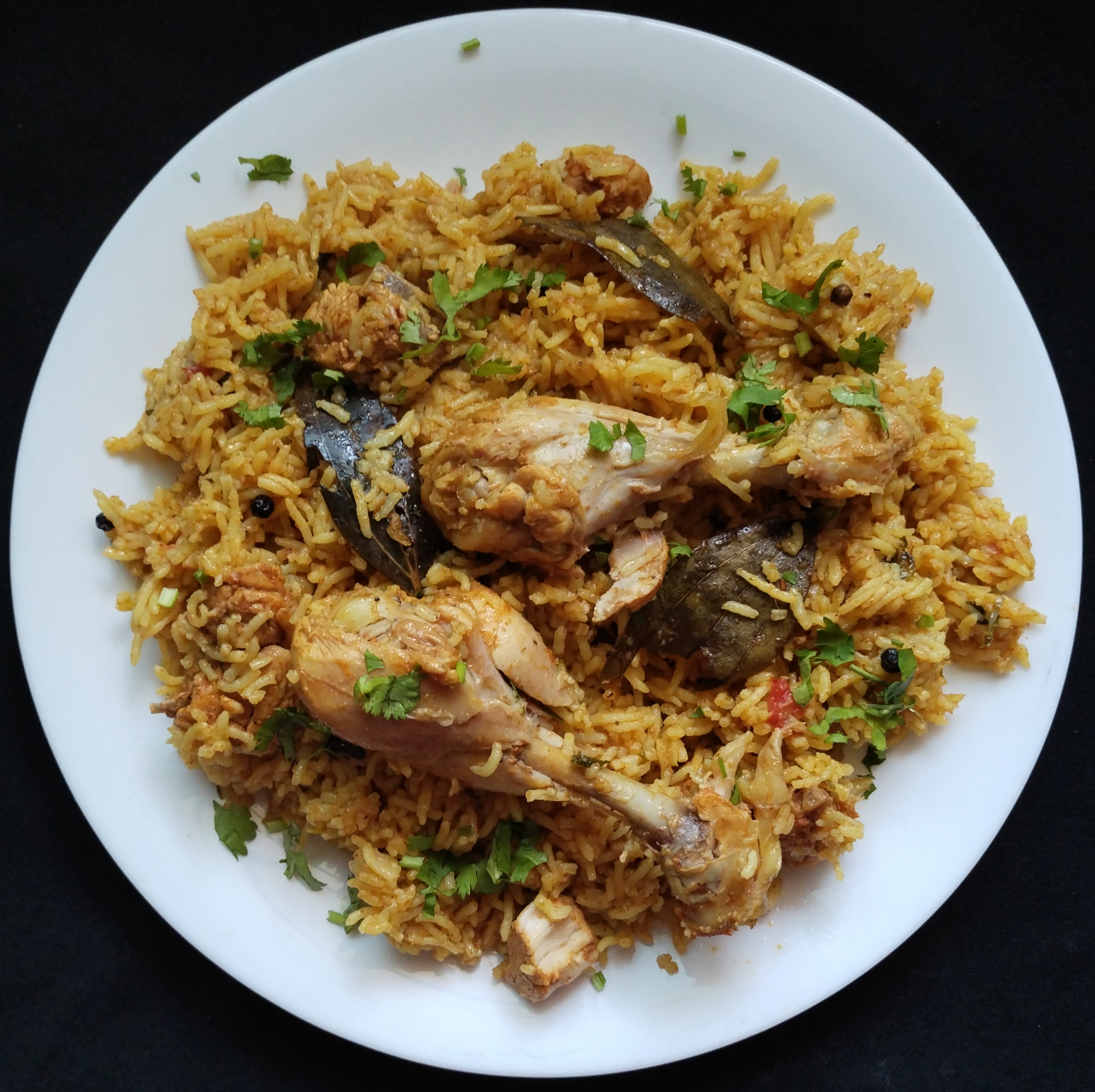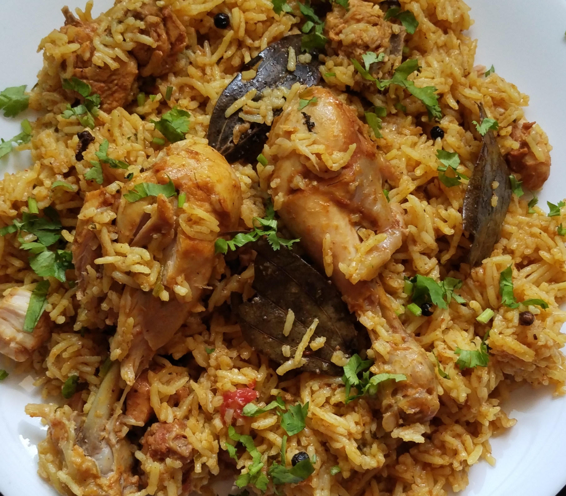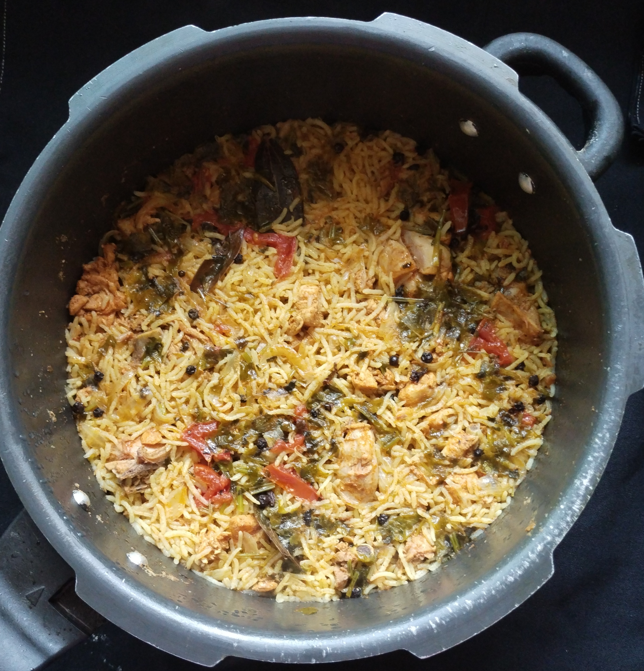 In a pressure cooker heat 2 tbsp ghee and 3 oil tbsp saute spices like bay leaf, cinnamon,5 cloves,1 star anise, cardamom ,1tsp pepper. Add in 3 onion and saute well ½ tsp ginger garlic paste. Tomatoes 💁 Add the prepared marinated chicken to the cooker and add red chilli powder, gram masala, coriander power, mix it nicely. Now add 1½ cup of basmati rice 💁🌾soaked for 20 minutes salt to taste, ½ tsp Biryani masala powder, little coriander & mint and 1 tsp ghee . pour 2-¼ cup of water. cover and pressure cook for 2 whistles.