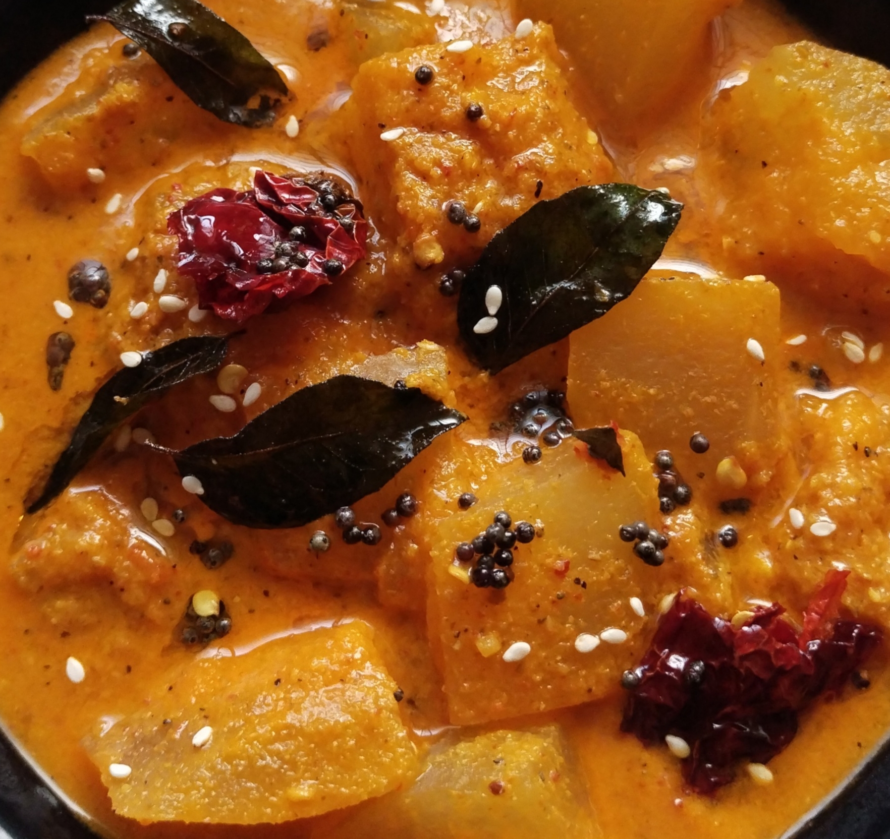 In a tempering pan heat oil, add in mustard seeds. Once they start poping, add in broken pieces of red chilli, curry leaves and sesame seeds ๐optional let them sizzle for few seconds. Add this seasoning to the curry and mix well.