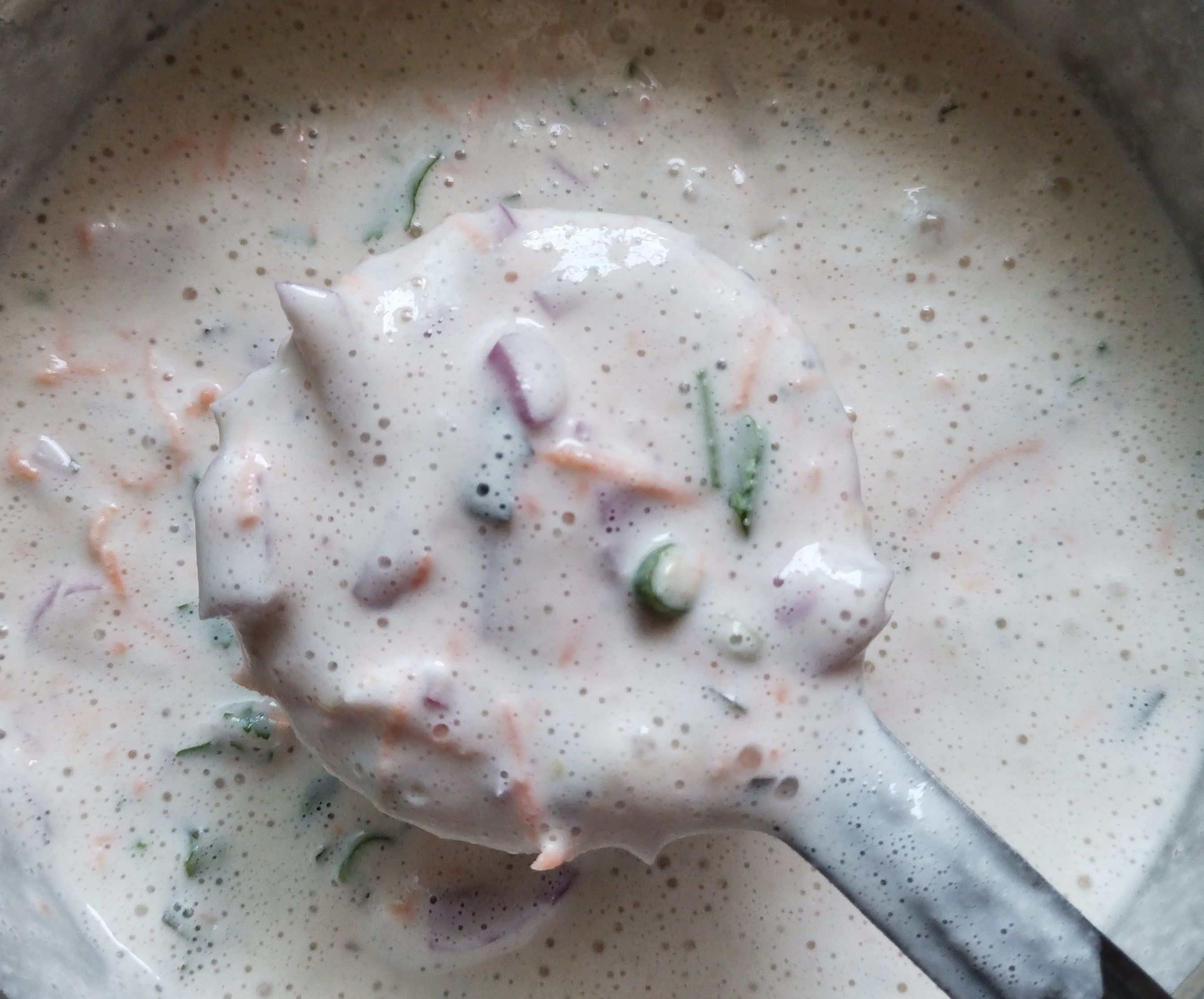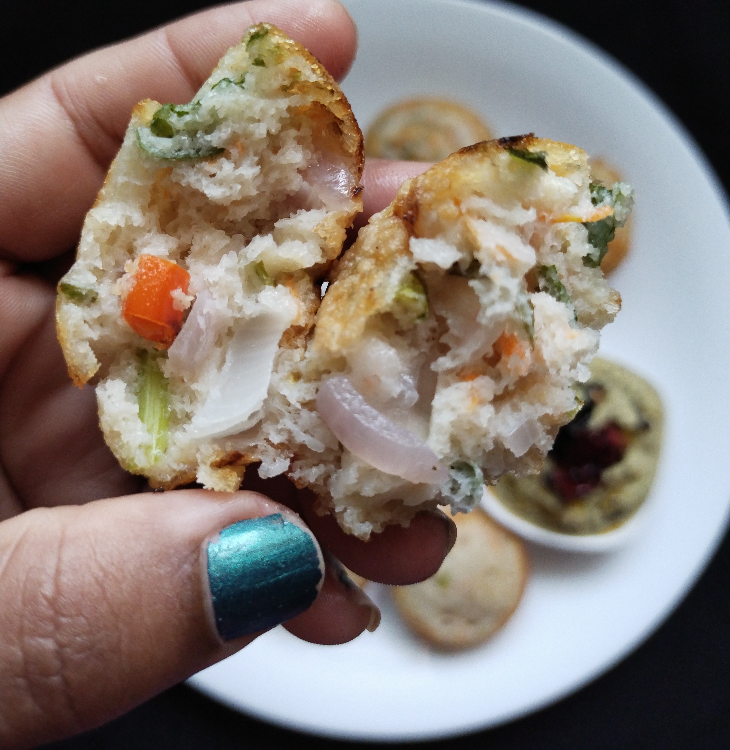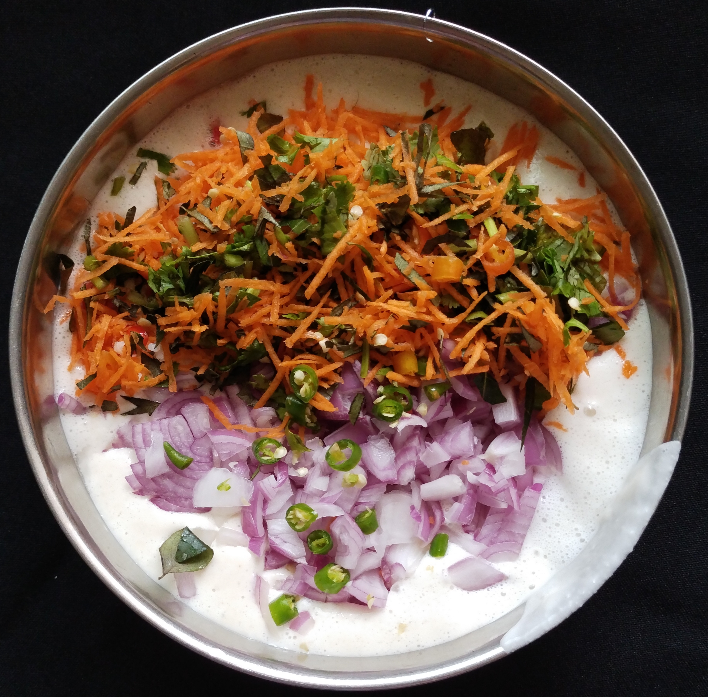 💁 Take required batter in a different bowl.💁Add finely chop onion, grated carrot, fresh chopped coconut pieces, green chilli , small bunch dil leaves ,coriander leaves and few curry leaves.mix it well now slowly pour the batter into each of the moulds with the help of larges spoon.reduce the heat to medium and cook for 3- 5 mins with a closed lid.once the batter gets cooked from bottom, slowly with the help of spoon flip it over and cook other side.
