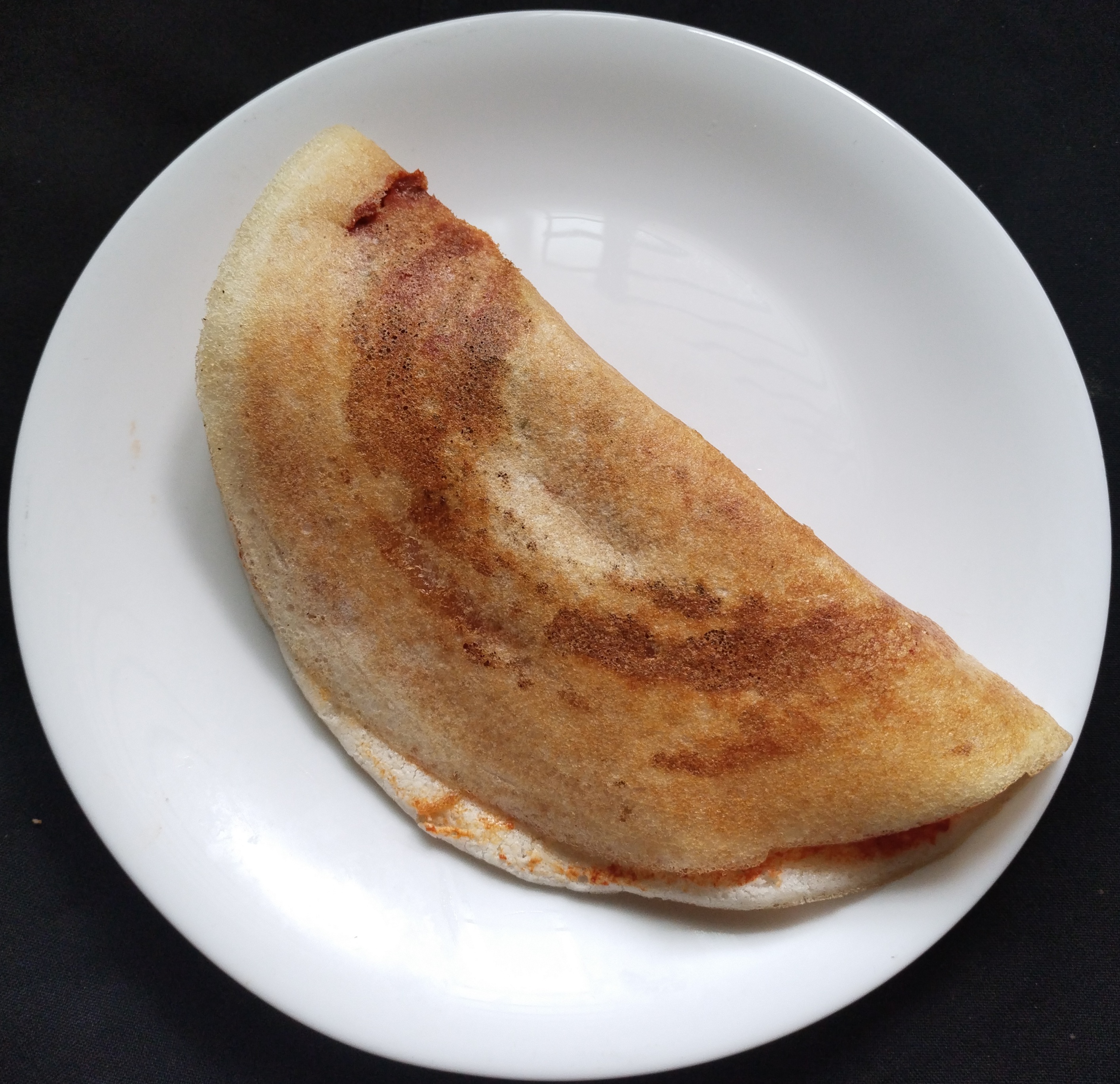 Heat griddle and pour a ladleful of the batter on it and spread it in a circular motion thin circle.also a little oil over it. then cover the dosa for a minute and.. Now add red chutney..keep the potato masala.. cook till the bottom of dosa turns golden brown finally, fold ….over to make a roll & any shape and serve immediately .