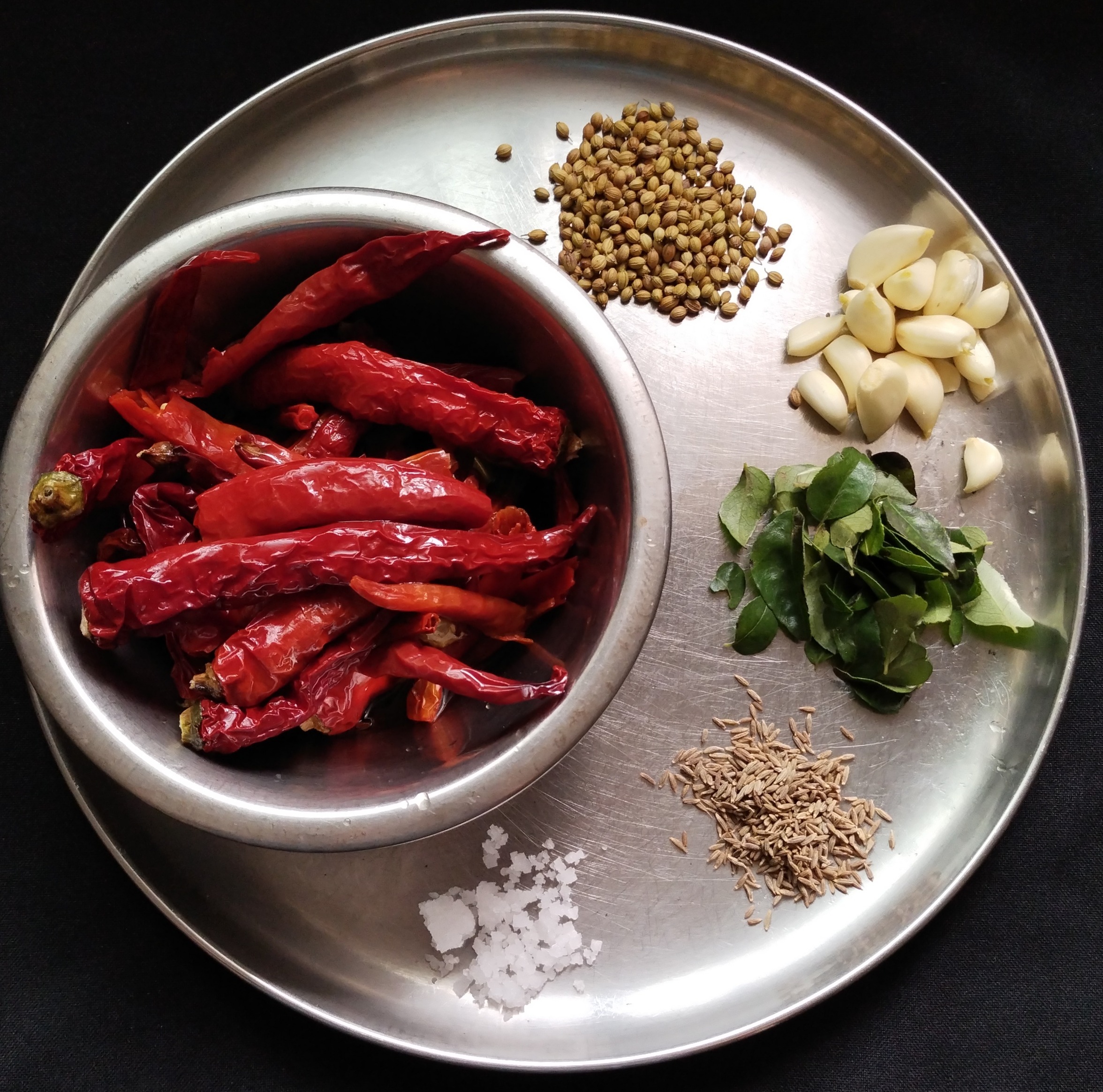 Take a mixer jar add garlic, zeera , coriander seeds, curry leaves, salt to taste & jaggery grind it along with soaked red chillies to paste 👉90 % coarsely adding very little soaked water. The consistency of the Chunety should be a 👉little thicker than the normal Chunety.