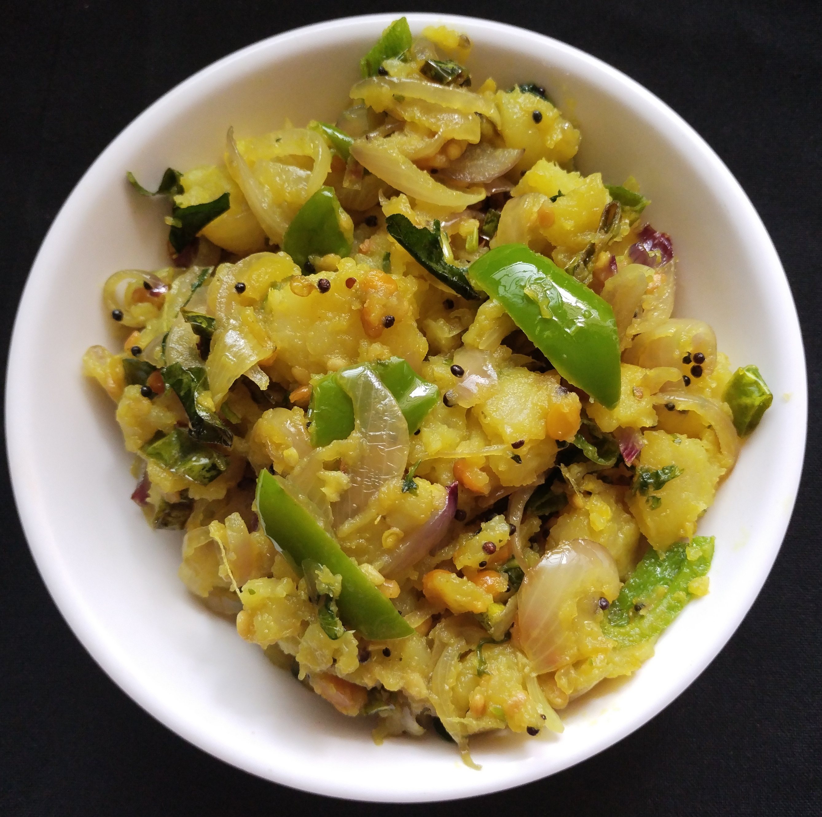 Heat oil in a pan add mustard. Curry leaves little chana dal, urad dal ,chopped green chillies…saute then add chopped onion & capsicum saute nicely. add haldi powder, little salt now add cooked potatoes smashed it should be in to small pieces add fresh coriander leaves mix it well cover and cook for some few mins.. ready to serve With dosa .
