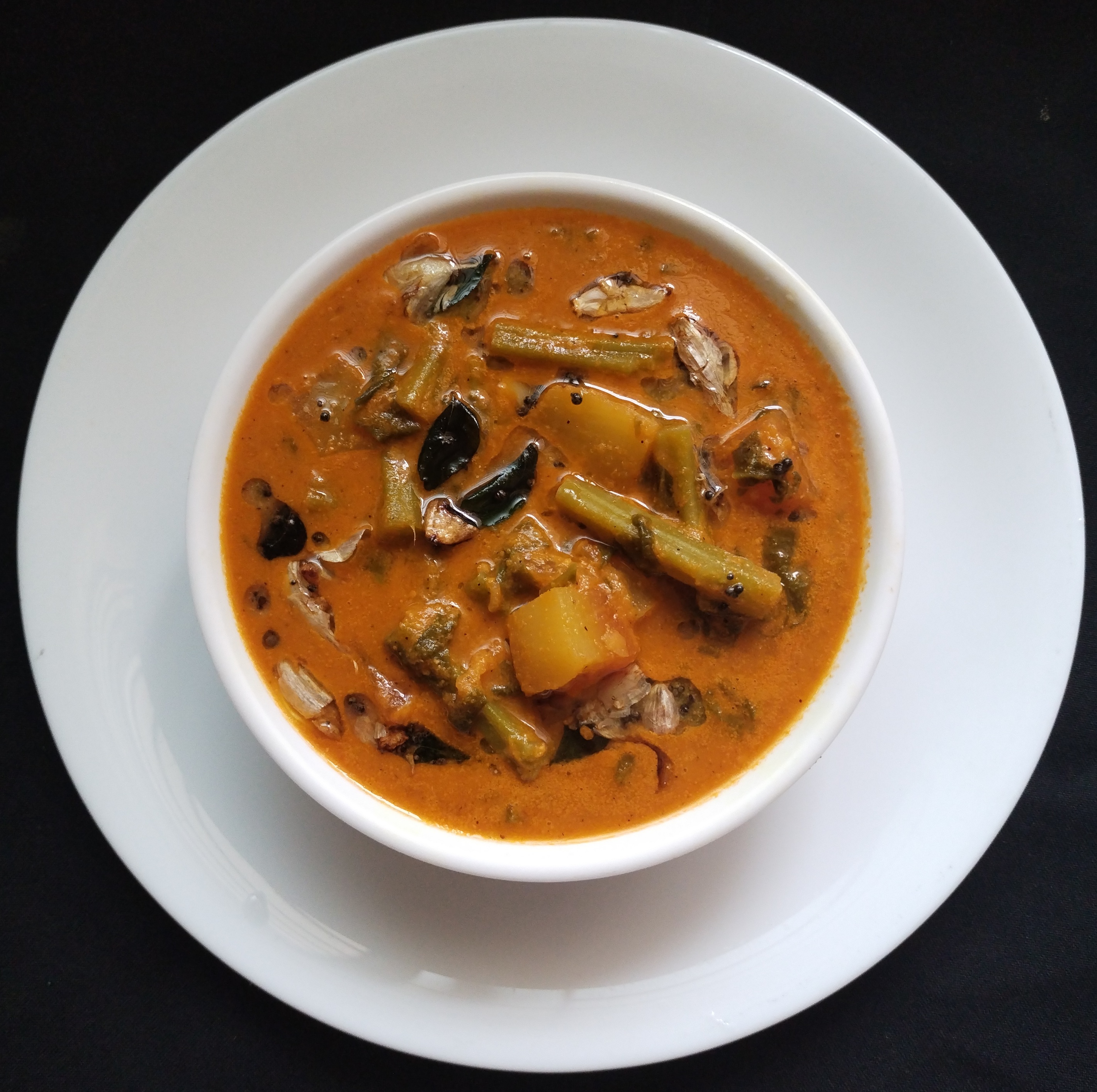 Take a pan dry roast red chillies, coriander seeds, cumin seeds, mustard seeds, 1 slice onion , 4-5 cloves garlic till onion change colour..prepare the masale in a blender along with fresh grated coconut & tamarind blend to the smooth paste by adding required amount of water keep aside.