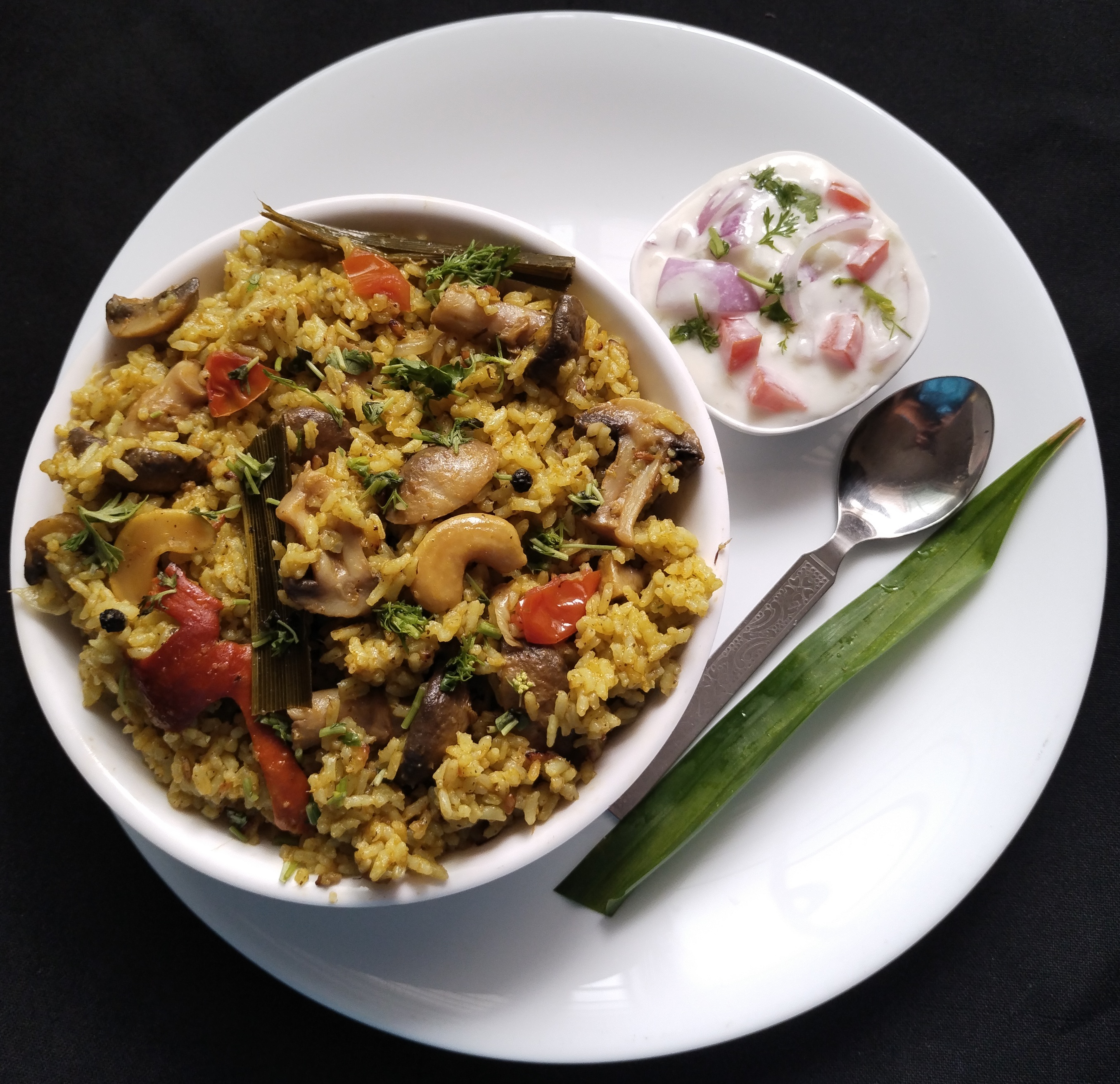 Hot and Spicy Mushroom Biryani ready to serve with raita.