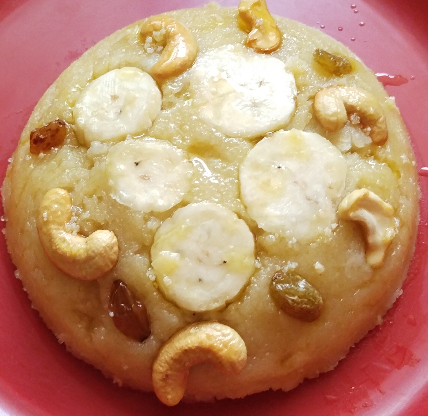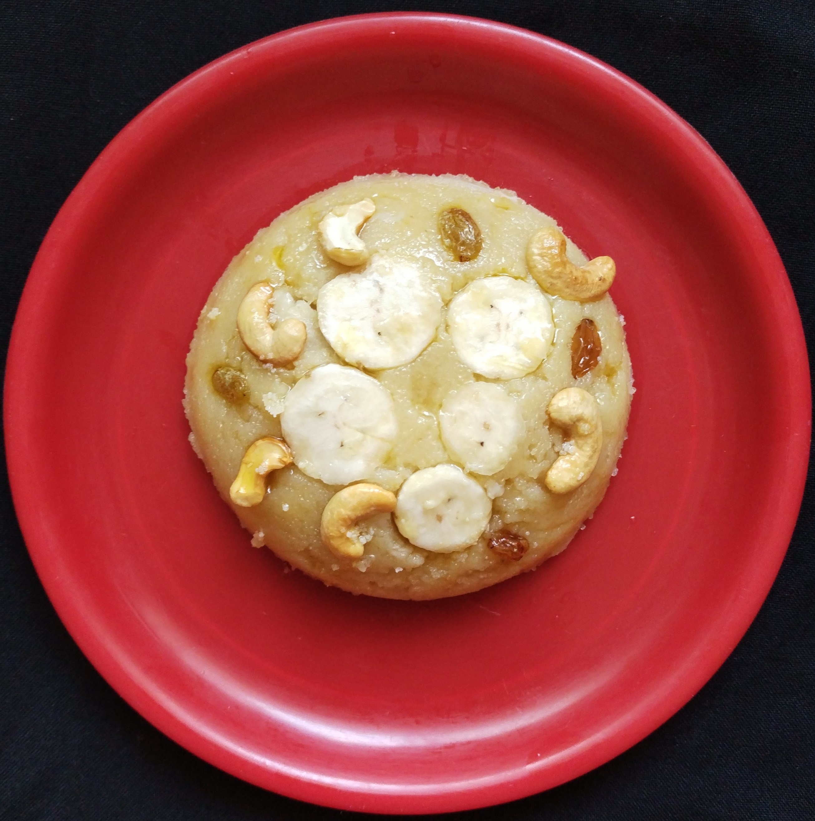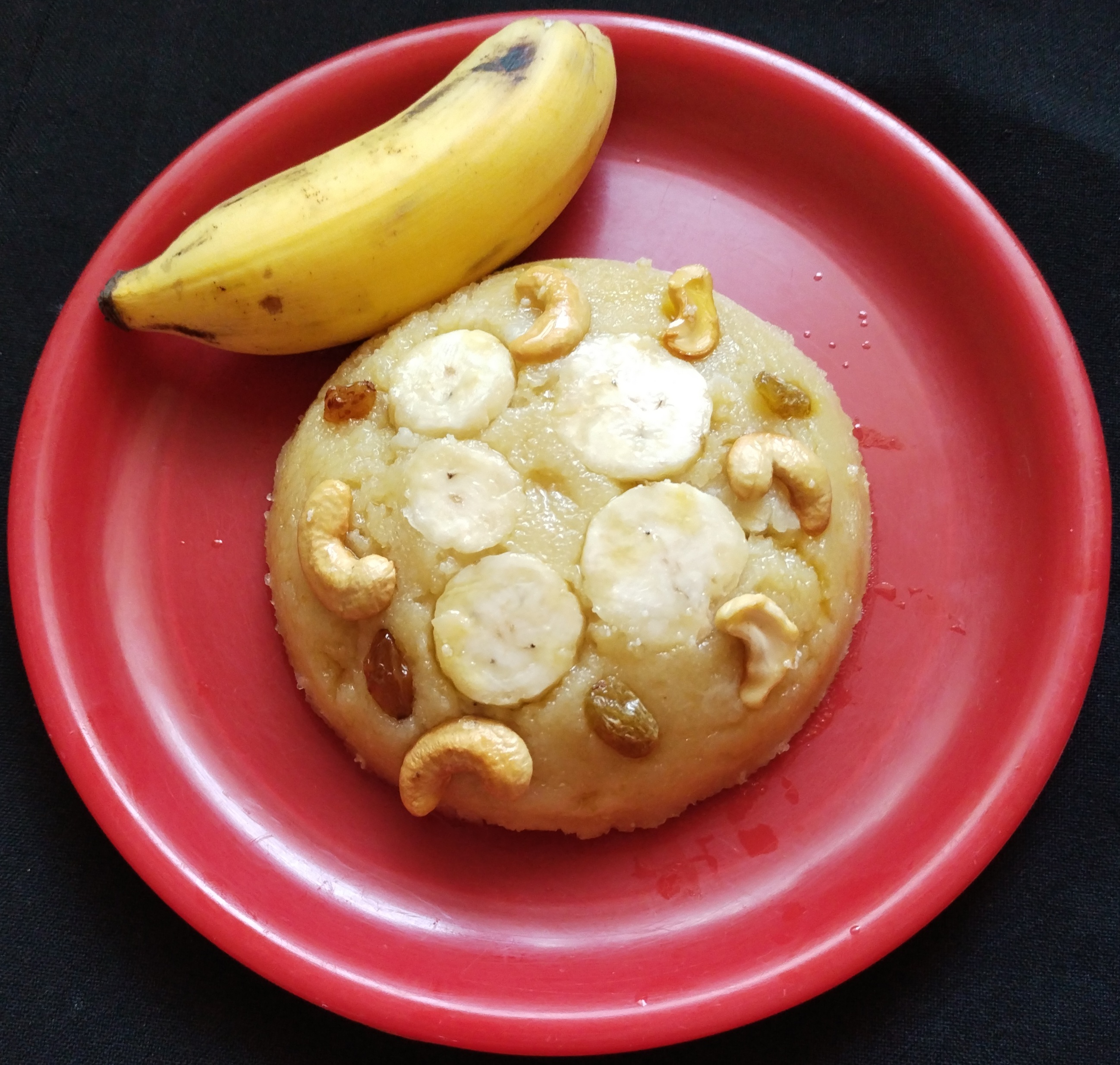 Garnish with fried cashews and a few chopped bananas Serve hot.