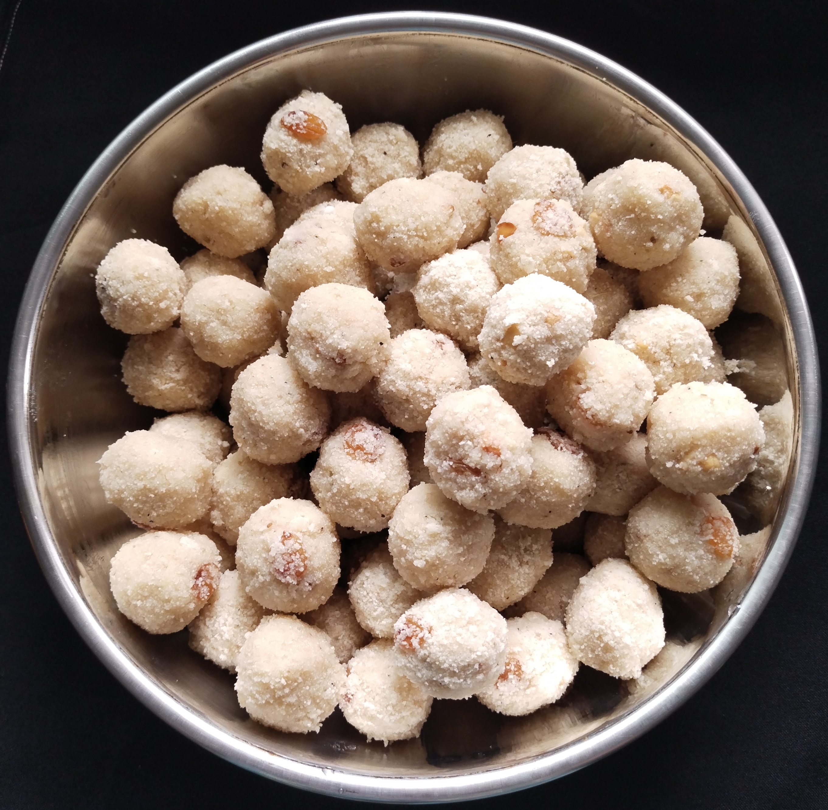 Take a small portion of the hot . Rava & sugar mixture and press down tightly in your fist and give a round shape and make Rava Ladoo.Garnish each Rava Ladoo with dry Raisins cashew nut while binding…ready to serve.