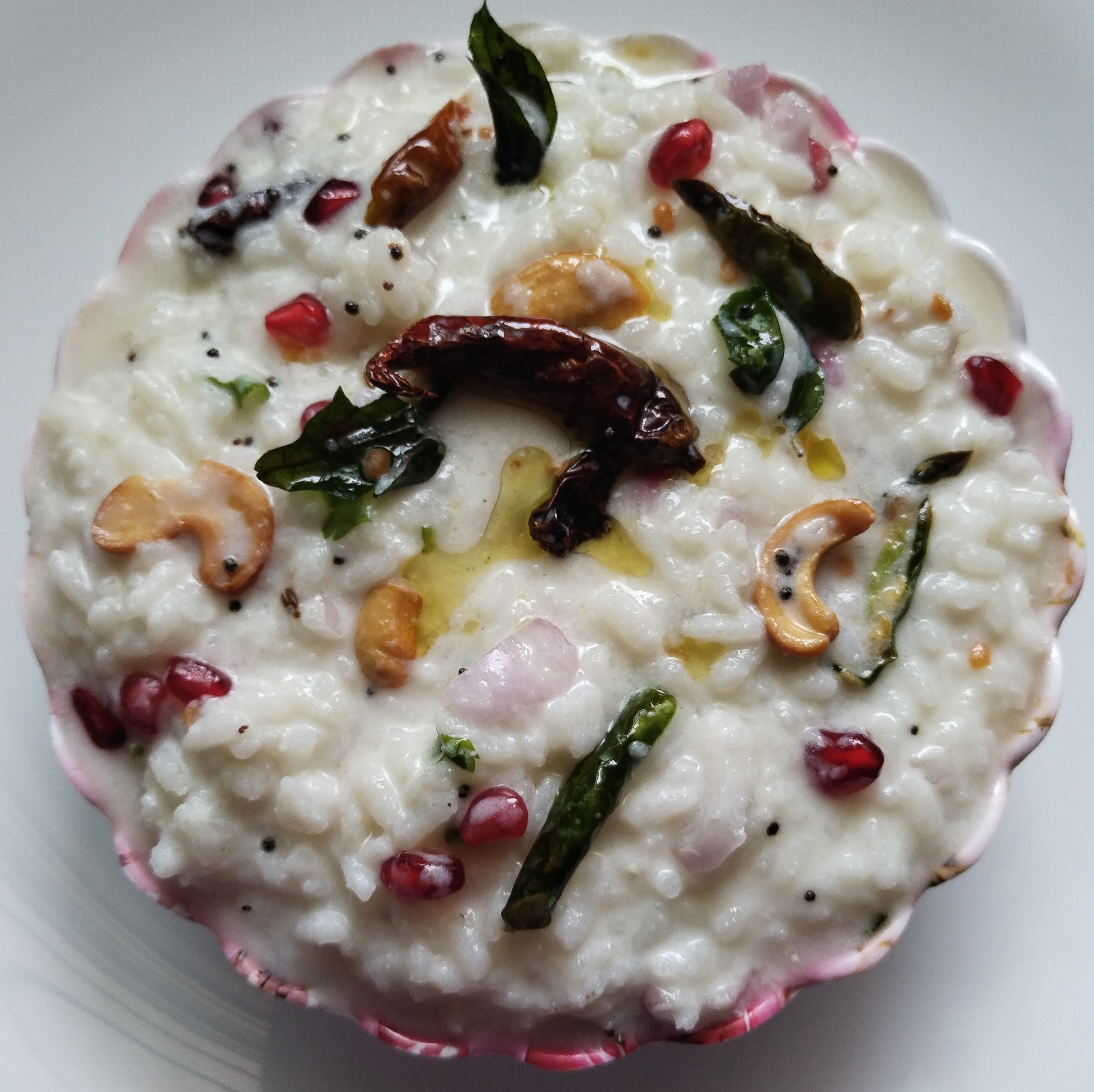Add urad dal, Chana dal and dry red chillies,green chillies,and fry until dal turns slightly brown.Pour the tempering over curd rice and chopped onions & Pomegranate mix well.
