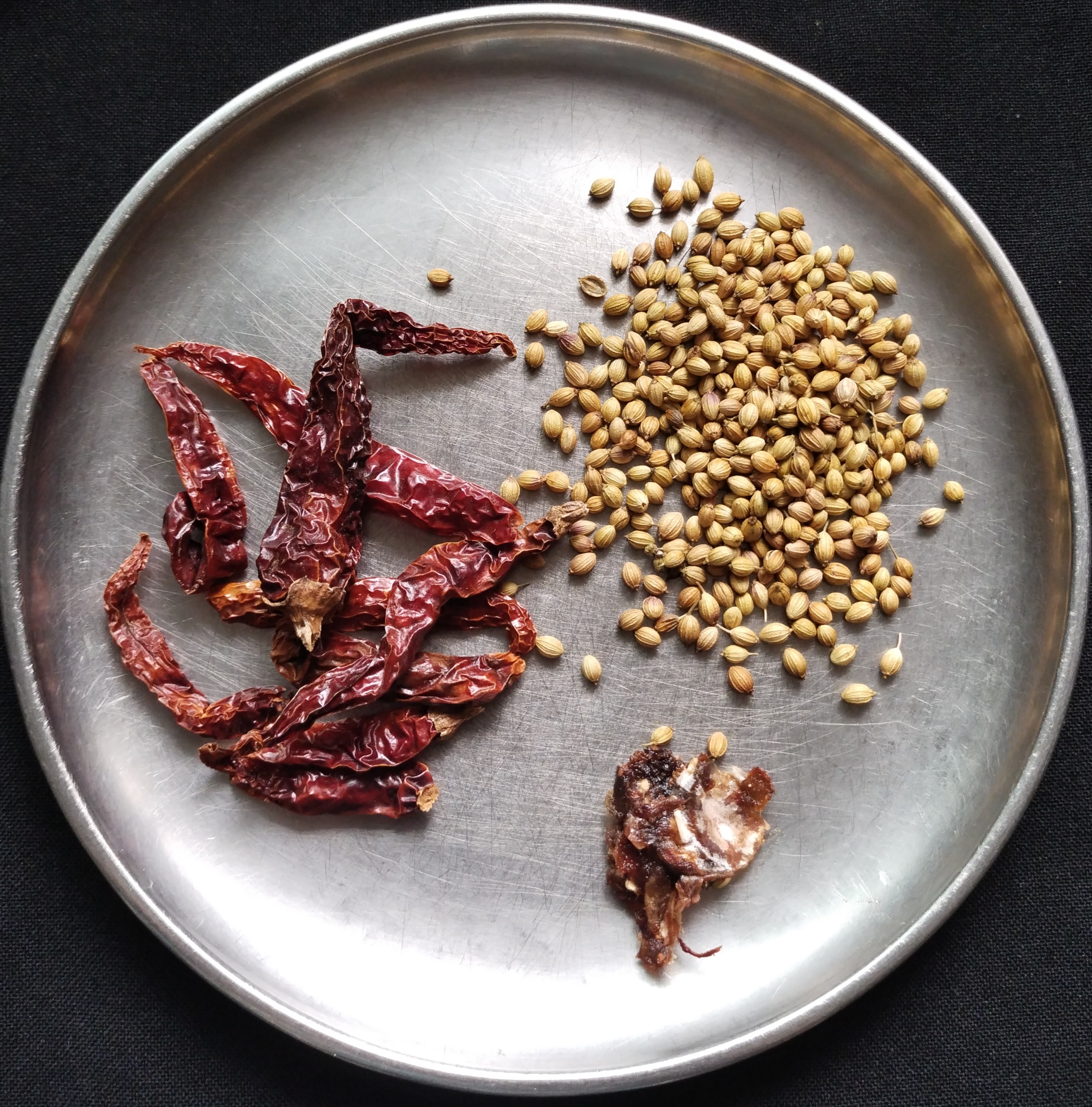 💁Meanwhile grind 🥥coconut , coriander seeds, tamarind & roasted red chilli into a coarse masala 💁without adding any 💦 water .