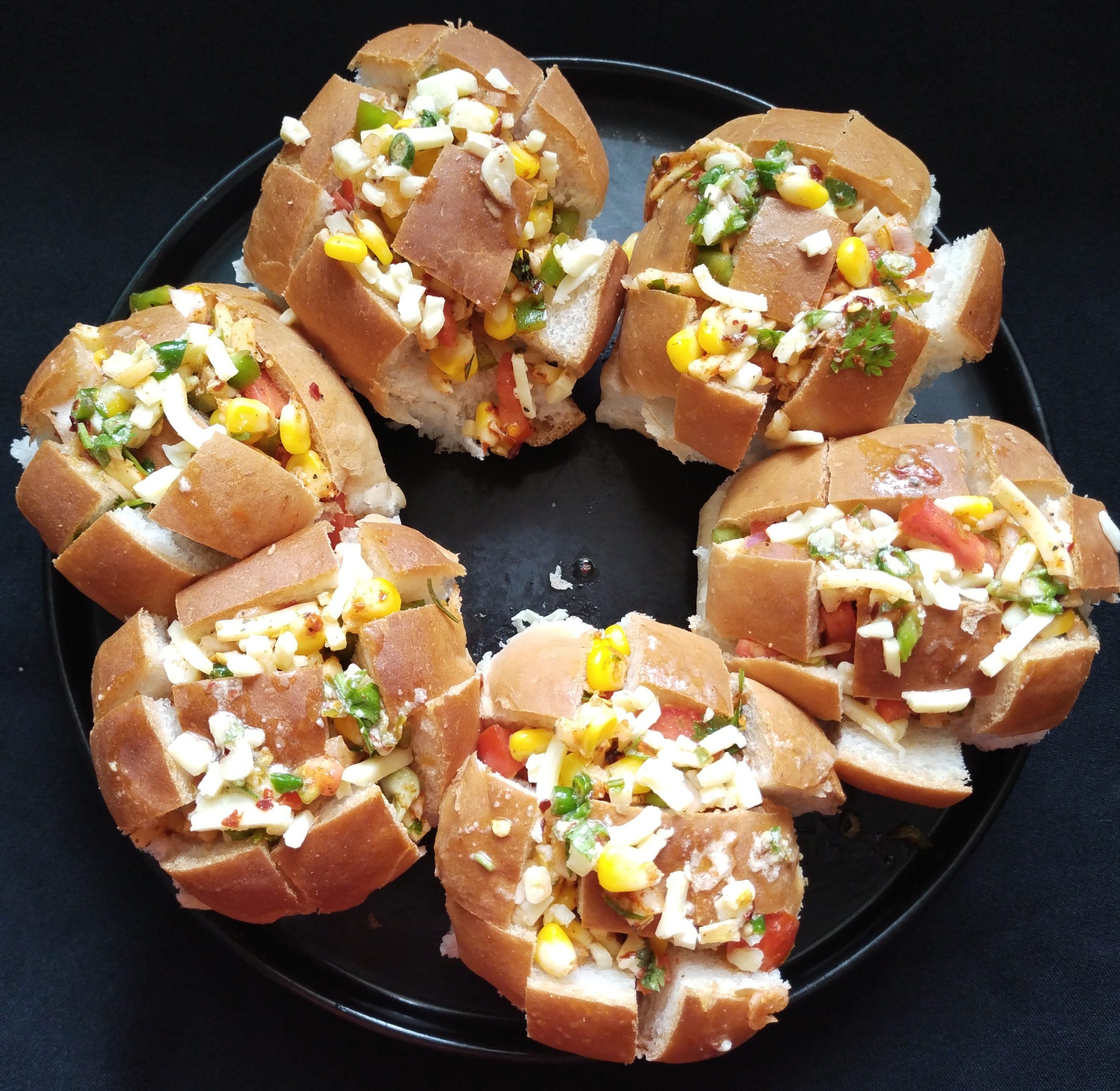 Make a slits in loaf of pav bread ๐ & fill the garlic ๐ง ๐ง butter & cheese veggies mixture in to the slits .