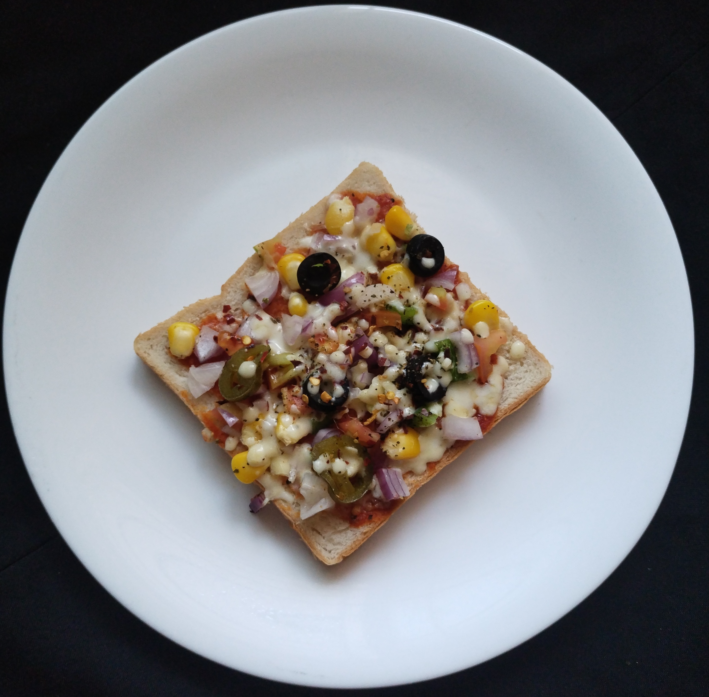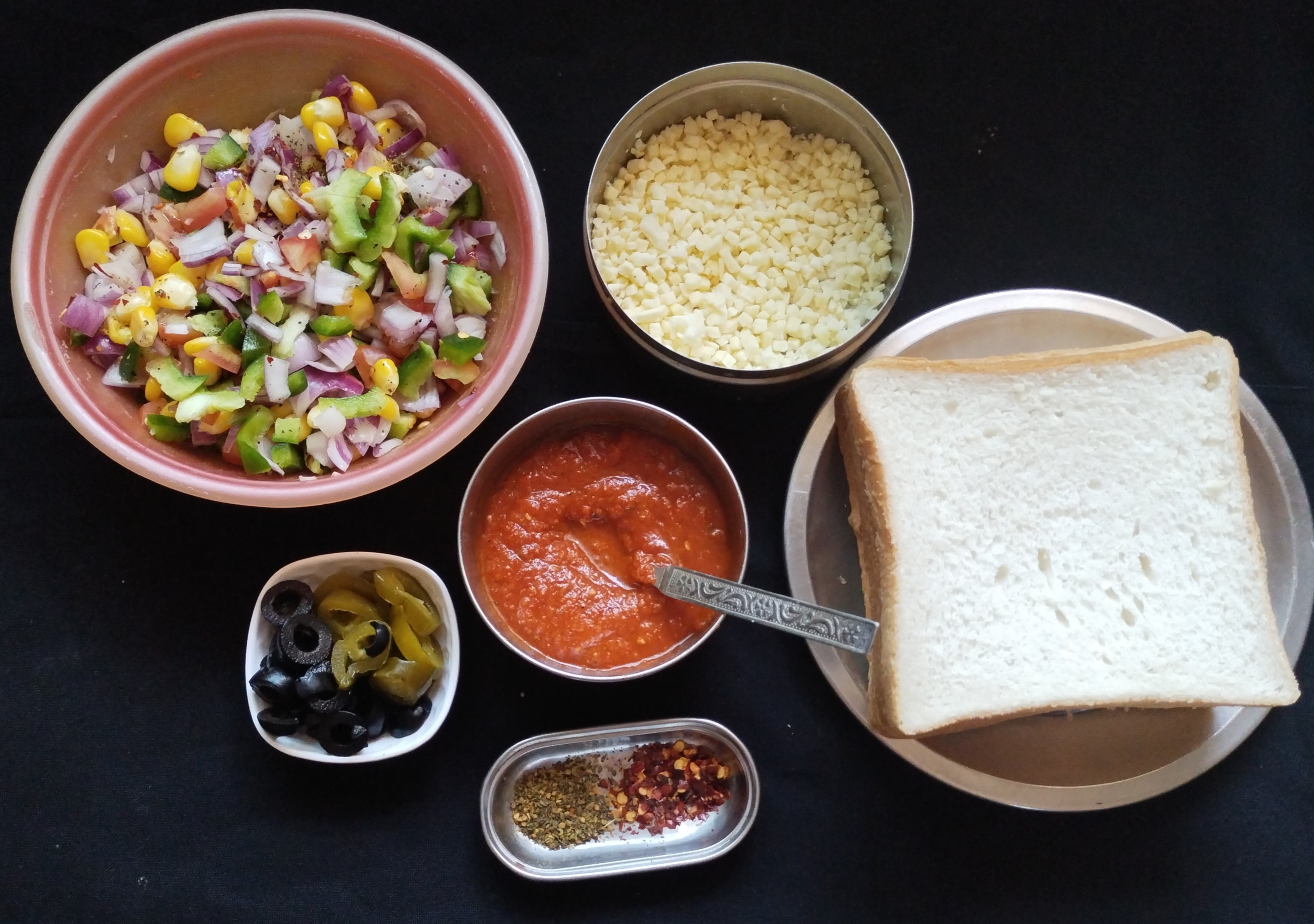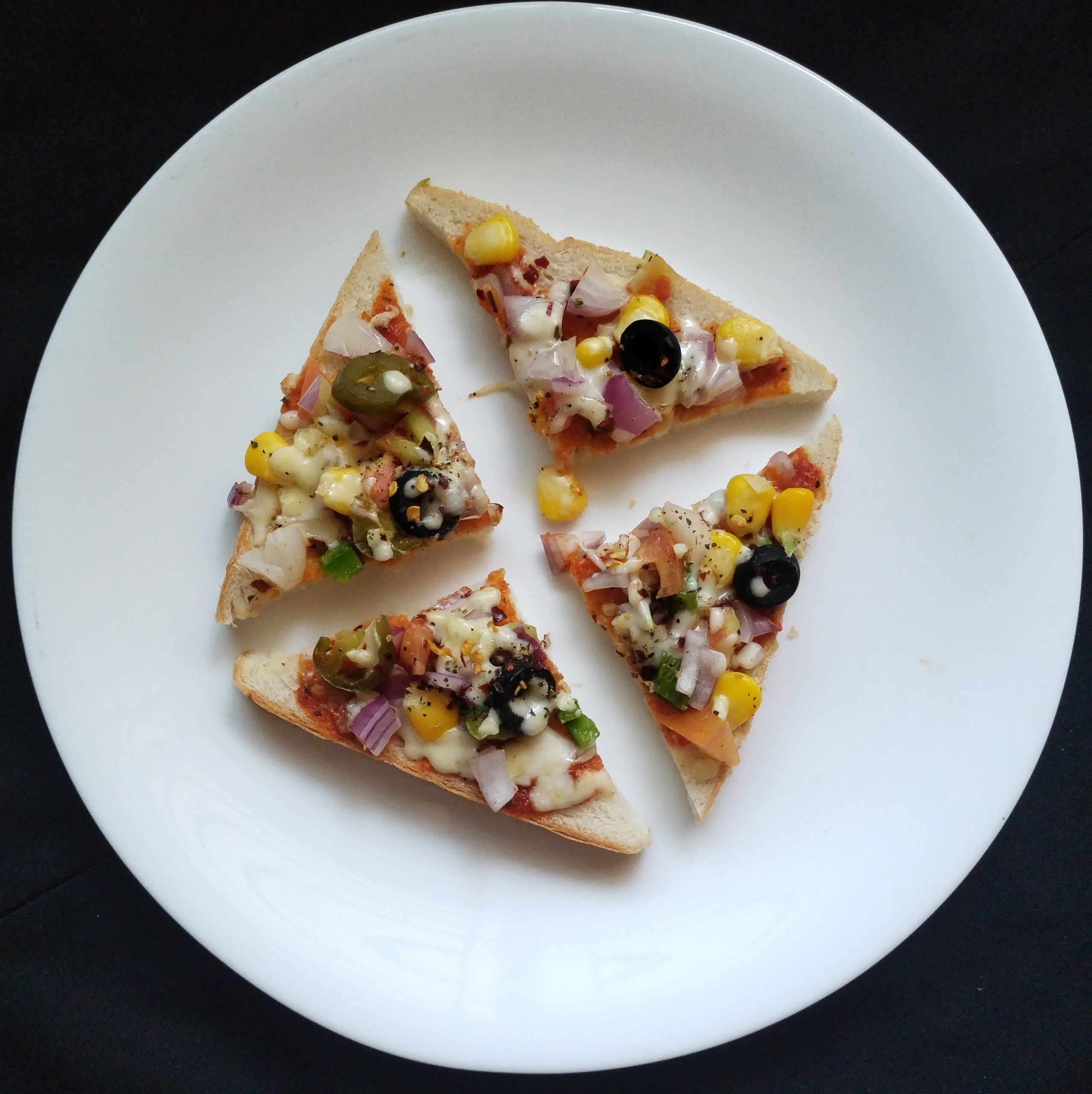 💁Apply butter on one side of bread 🍞 slices.On the butter side. Now apply prepared pizza Sauce evenly spread and top with u r Choice of veggies & few Black olives ,few Jalapenos.