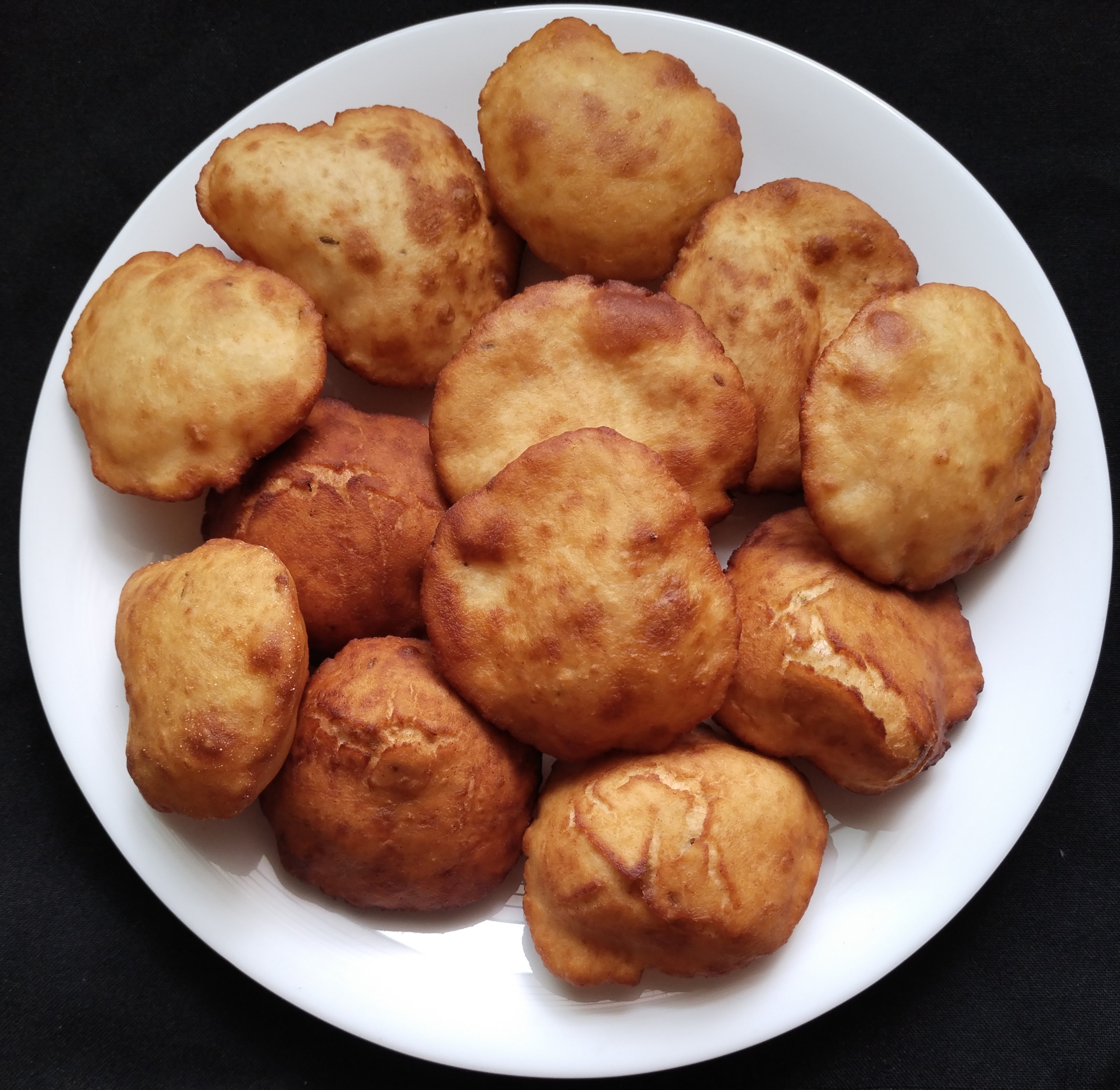 Dust excess flour off the rolled buns and fry them one by one on medium flame. As soon as you drop the buns into the oil they puff up beautifully, flip them over, keep them pressed under the oil for few seconds, that helps the buns puff up more.