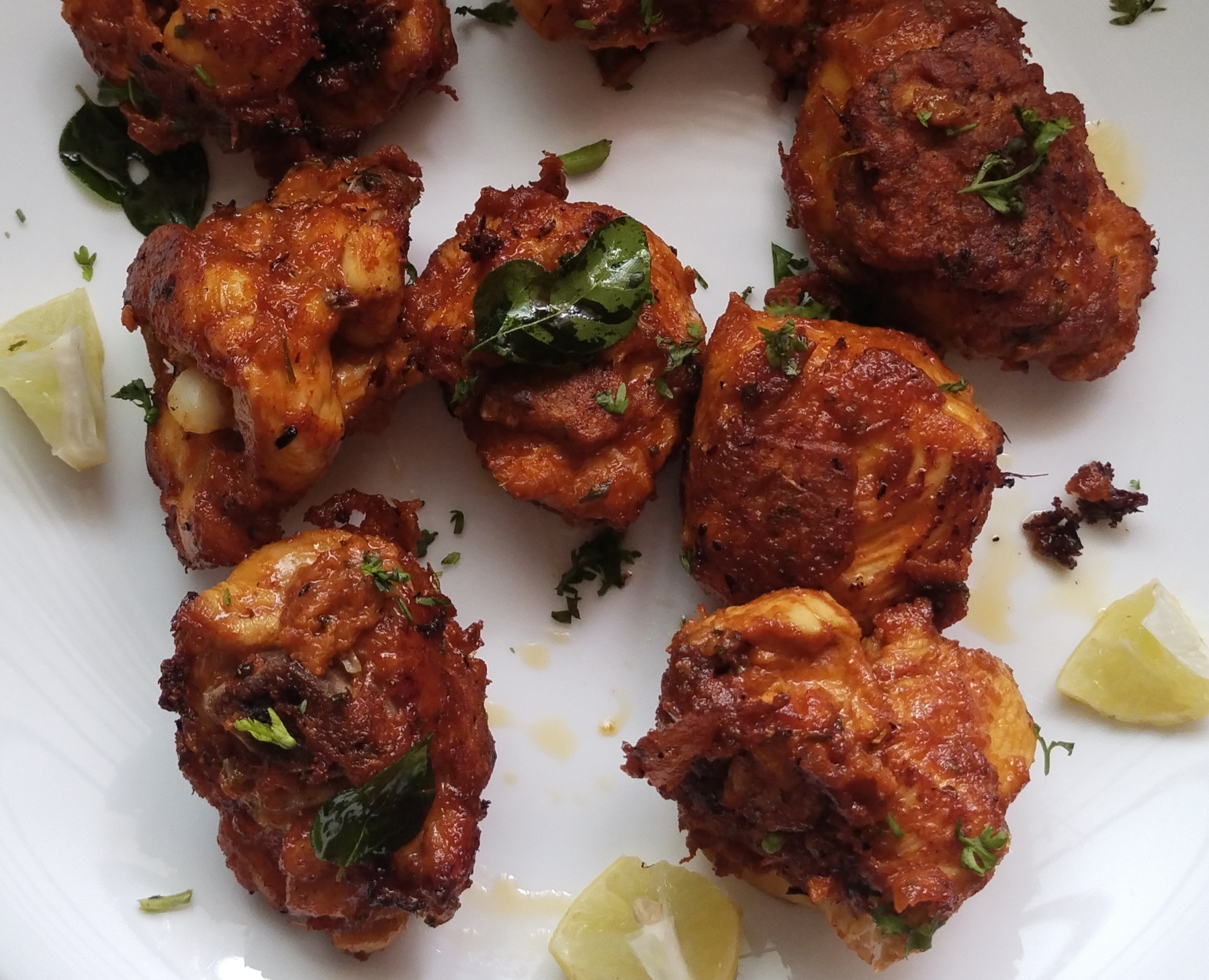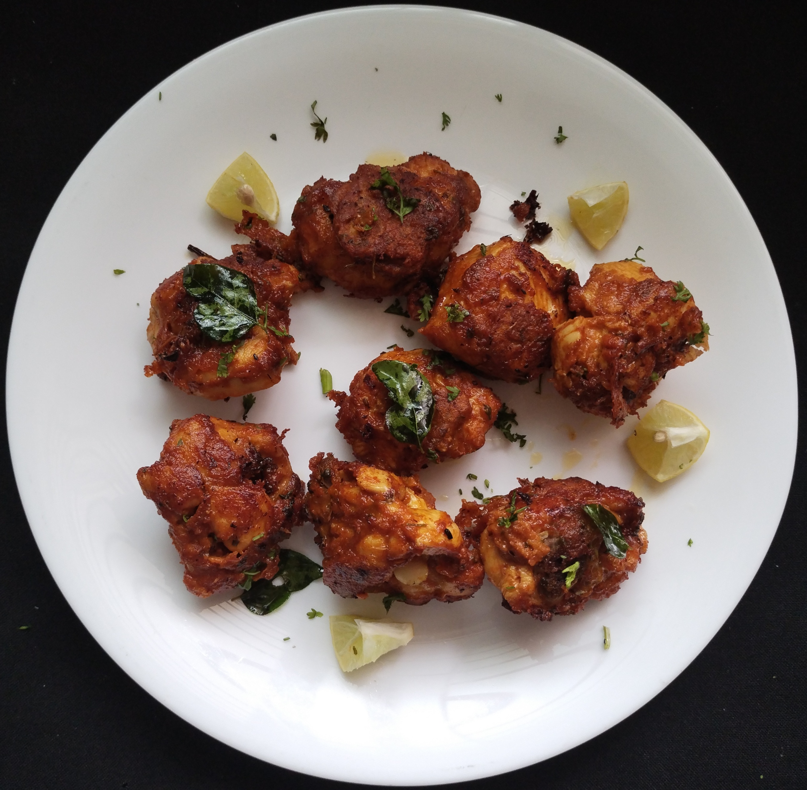 The marinated chicken pieces need to be cooked till they turn golden brown. Add curry leaves fry few seconds.