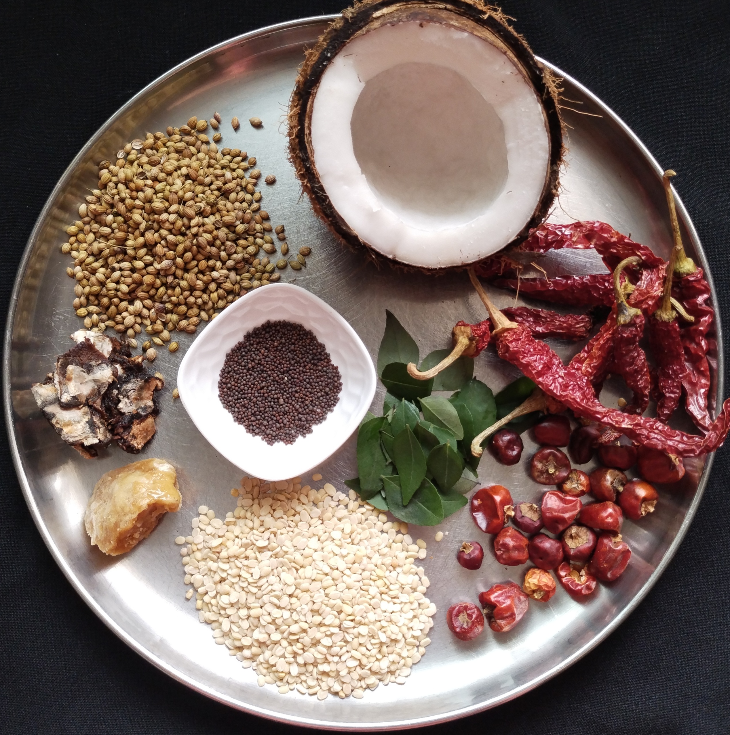 Once they cool, grind them with coconut, salt, jaggery and tamarind into a coarse paste