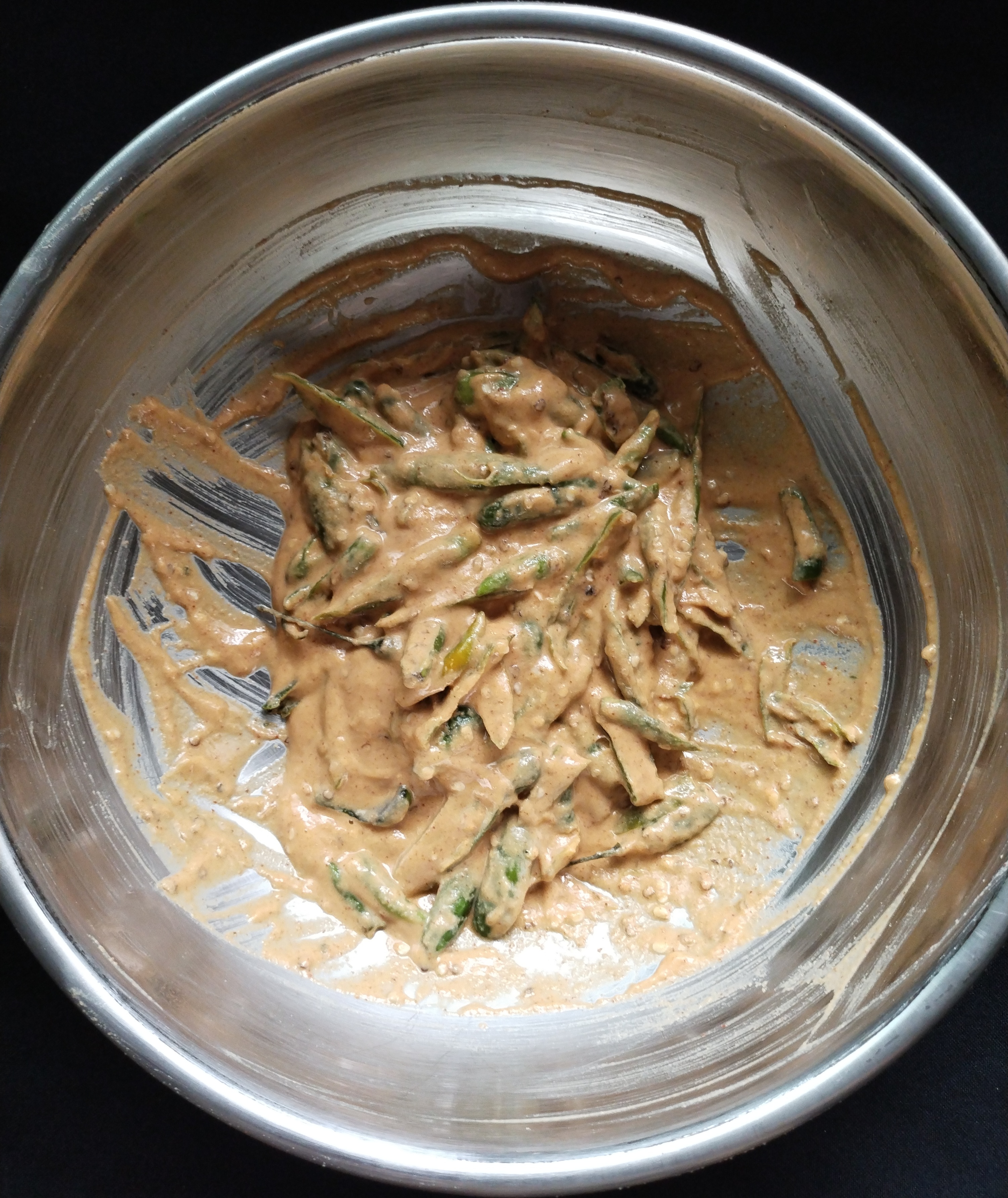 Sprinkle water 💦 to wet the chillies lightly. Add besan as much as the chillies get covered from all sides.check Salt adjust taste. Mix well. Make a thick batter.