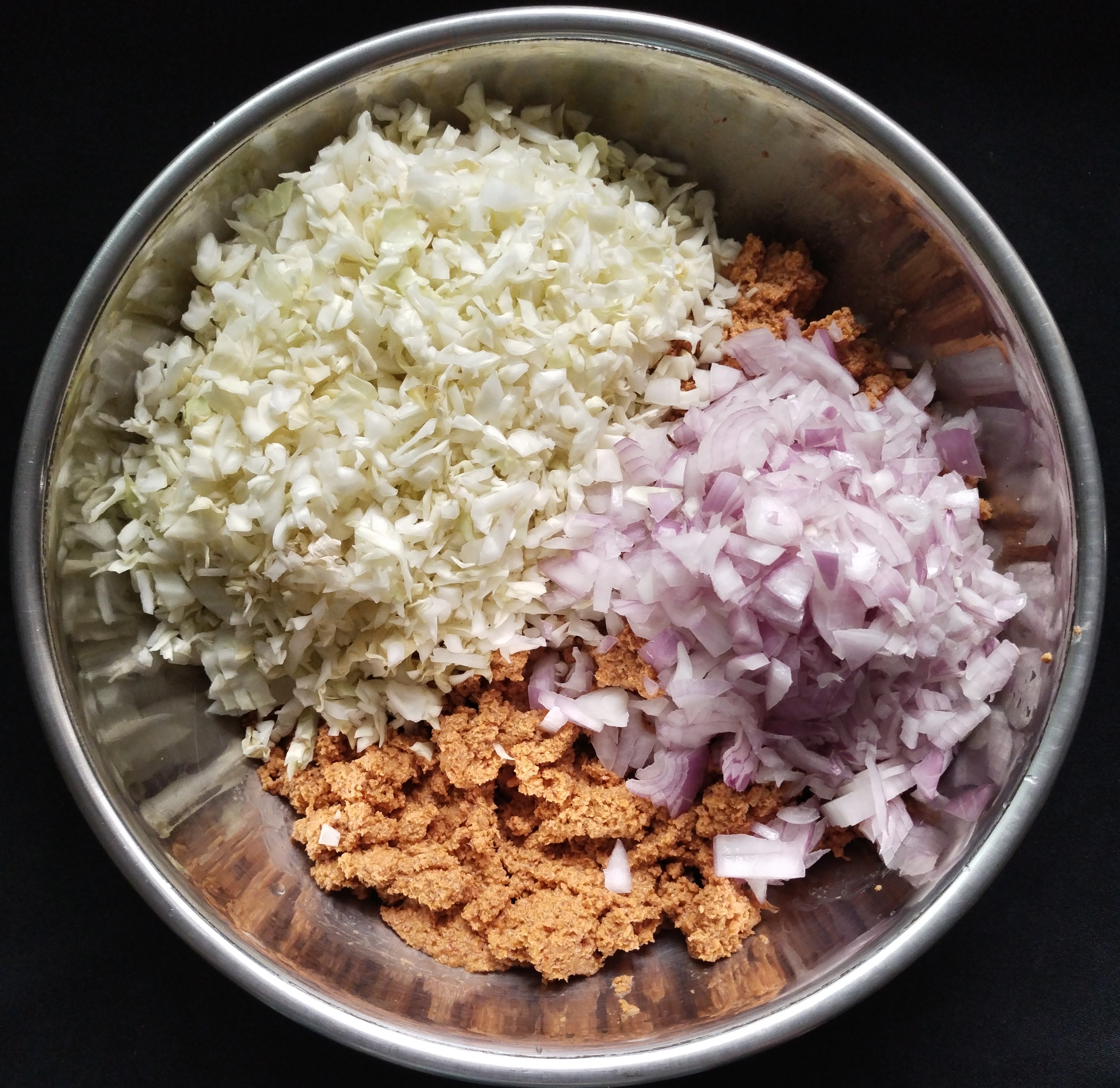 Add the finely chopped cabbage and onions to the batter and with salt mix nicely in ur ✋hand.