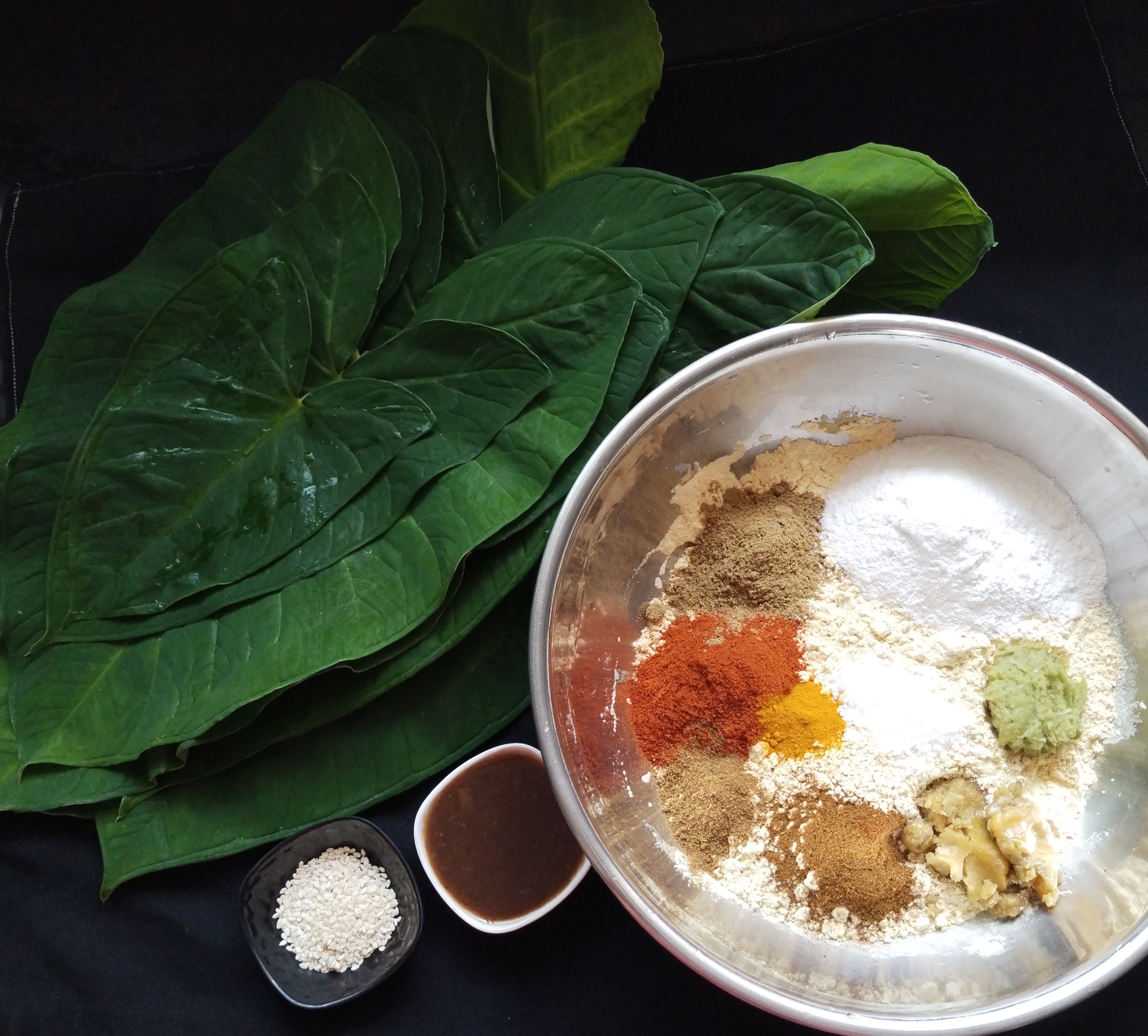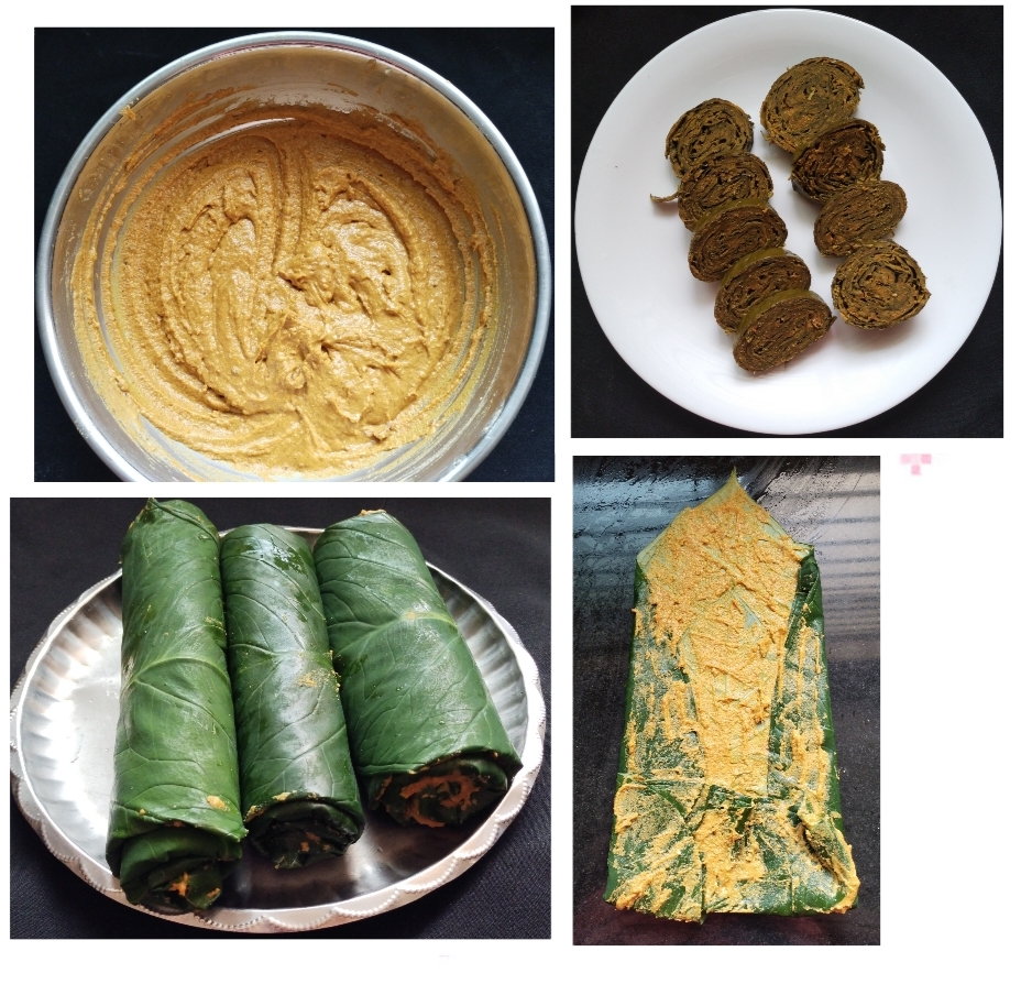 Now, take one leaf on a big plate or the kitchen💁 counter. Place the leaf in such a way that the base of the leaf should be near you. On the light green side of the leaf 👉opposite side👈 apply the prepared chickpea batter and spread it evenly throughout the leaf Now, place another leaf on the first leaf. The leaf should be placed in the opposite direction of the first leaf such that the pointed portion of the second leaf should be near you.Similarly, evenly apply the chickpea batter on the second leaf.👉Although I used 5-6 colocasia leaves in 1 roll, you can use more leaves in1 roll👈 Ensure to keep the chickpea batter thick. It should not be liquid-like or the colocasia leaves won’t stick together.