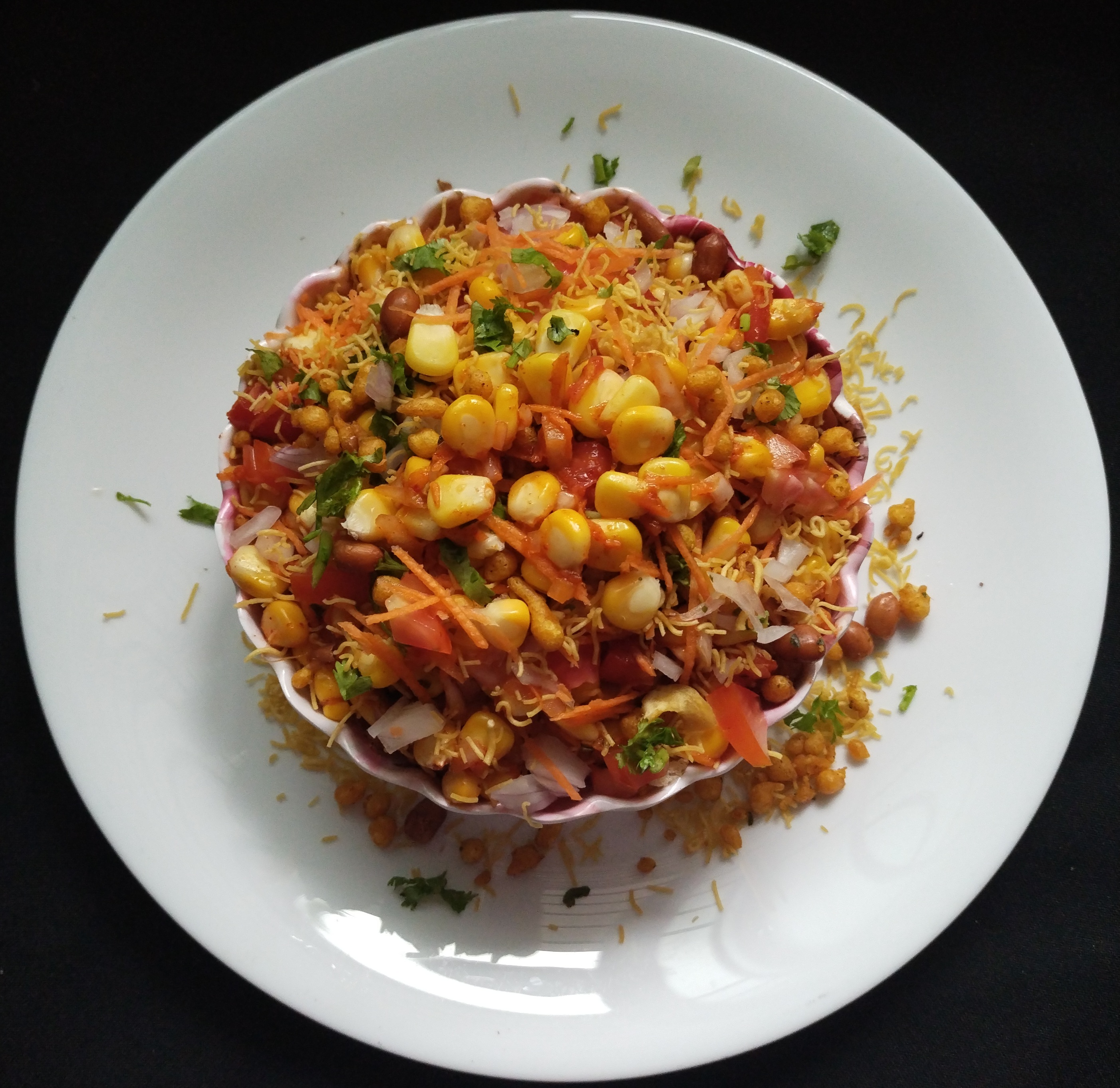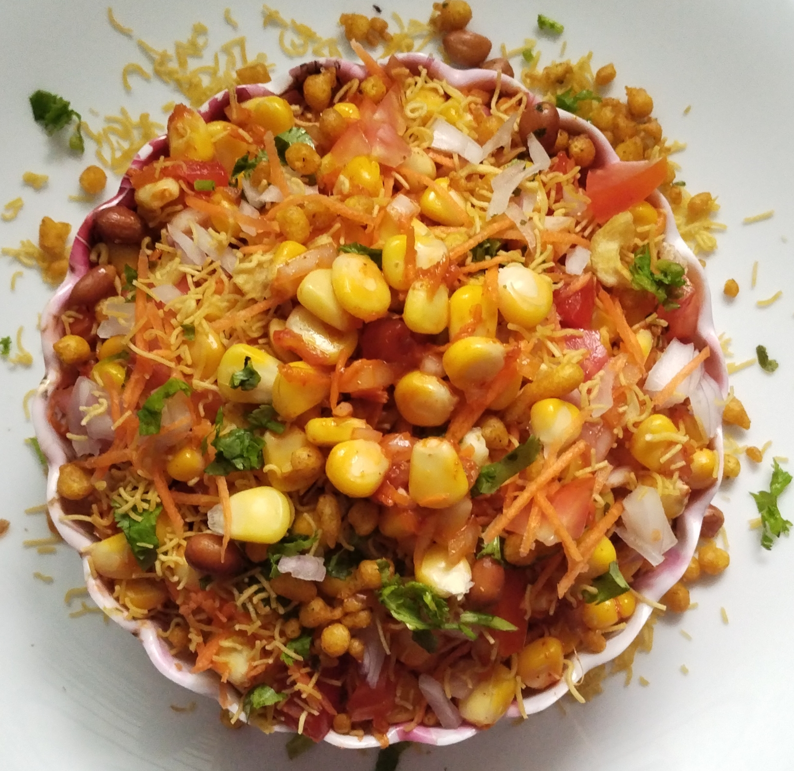 In a mixing bowl, take finely chopped onion, tomato, grated Carrot sweet & spicy chutney, red chilli powder, chat masala power mix well. Add chopped coriander leaves , 🍋 Lemon juice & cooked sweet corn kernels . Mix again nicely . Now serve corn masala chaat on serving plate. on top sprinkle Kara Boondis & plenty of sev Ready to serve… 🤗😋