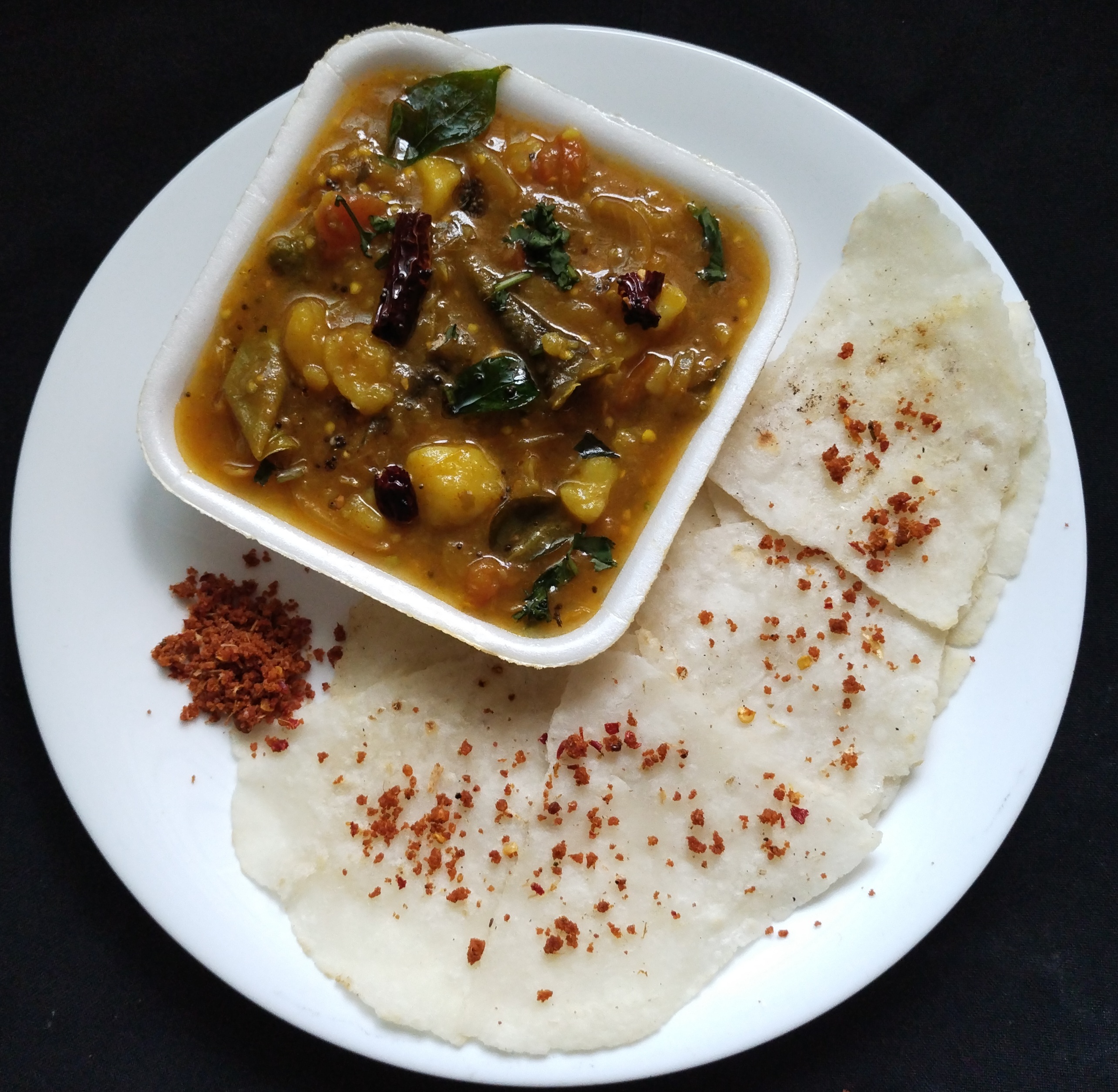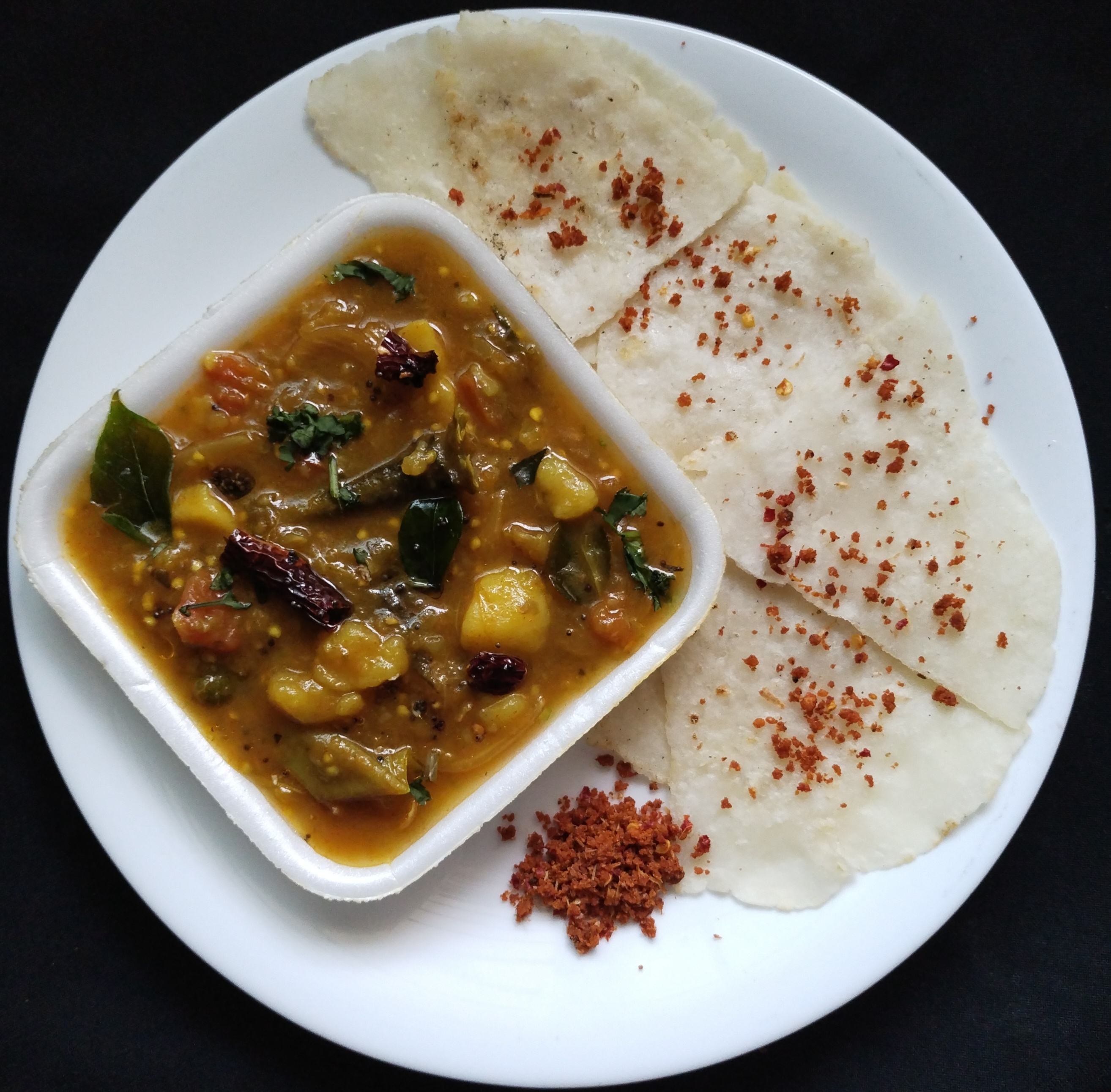 Now add the mashed Brinjal, potato & green chillies.add drained water from the veggies ,tamarind extract & jaggery allow it to boil nicely for 3-5 mins. 💁This gravy should be slightly watery consistency.add handfull ✊of chopped coriander leaves…Ready to Serve Brinjal Kosumalli Garnish with plenty of coriander leaves goes well with Akki Roti ,Idiyappam , Idli, Dosa , Chapathi & Hot Rice too.